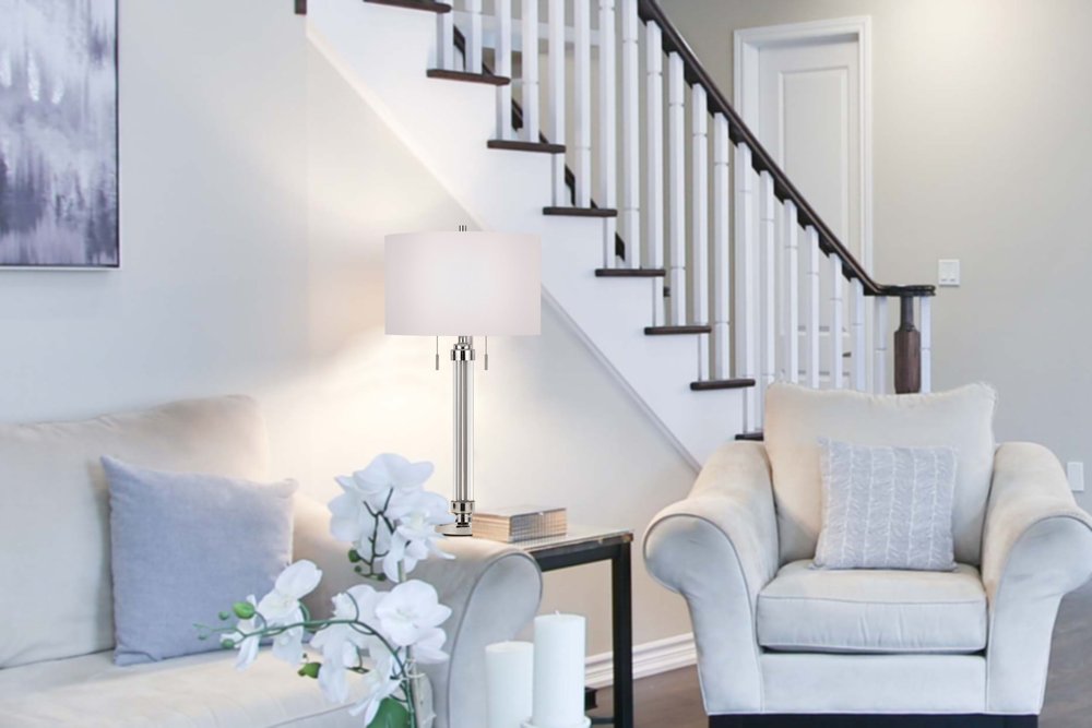 Add a bright anchor to your room with this 31-inch silver metallic metal two light cylinder table lamp with white drum shade. A gorgeous silver metallic metal base brings just the right amount of pizzazz to this fabulous lamp. The white shade has a drum shape and is made of linen, which makes it a perfect choice. This standard table lamp is designed to provide general lighting to the area. High quality design makes this a great lamp for not only lighting, but accenting a room with style. It is perfect for virtually any decor. 31-inch H x 16-inch W x 16-inch D
