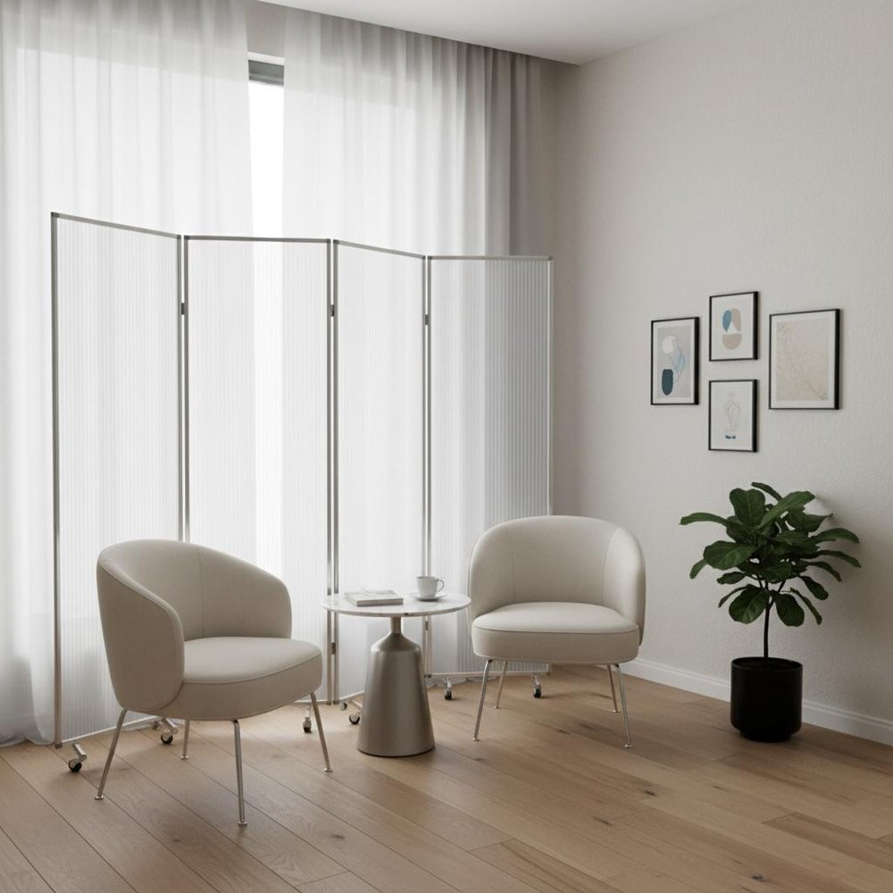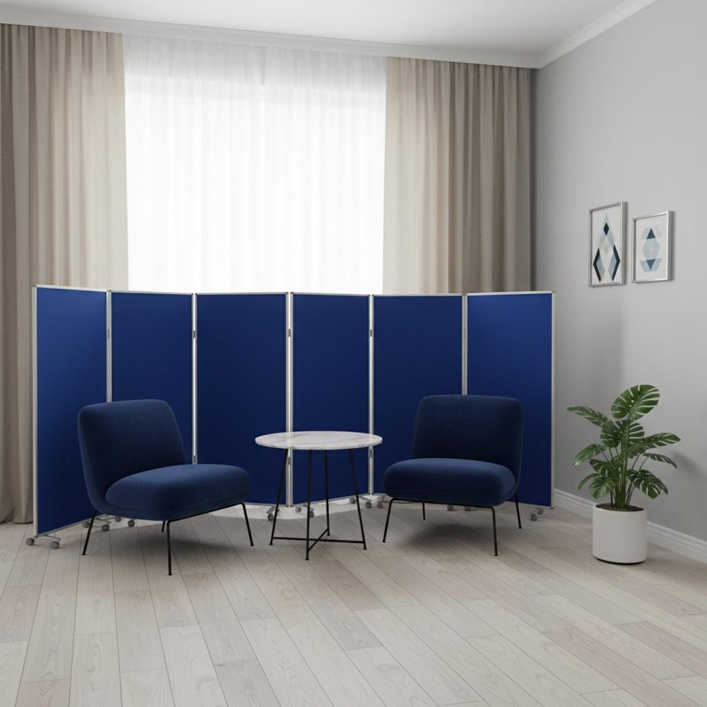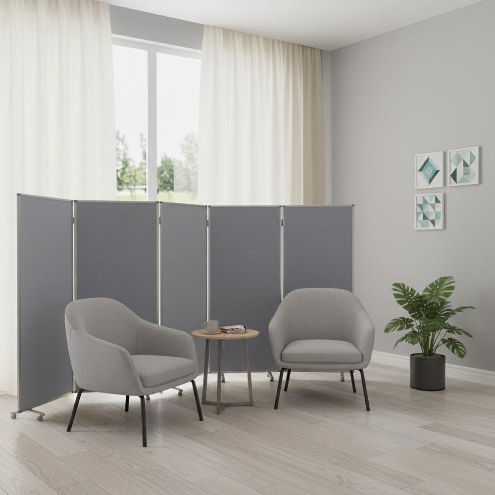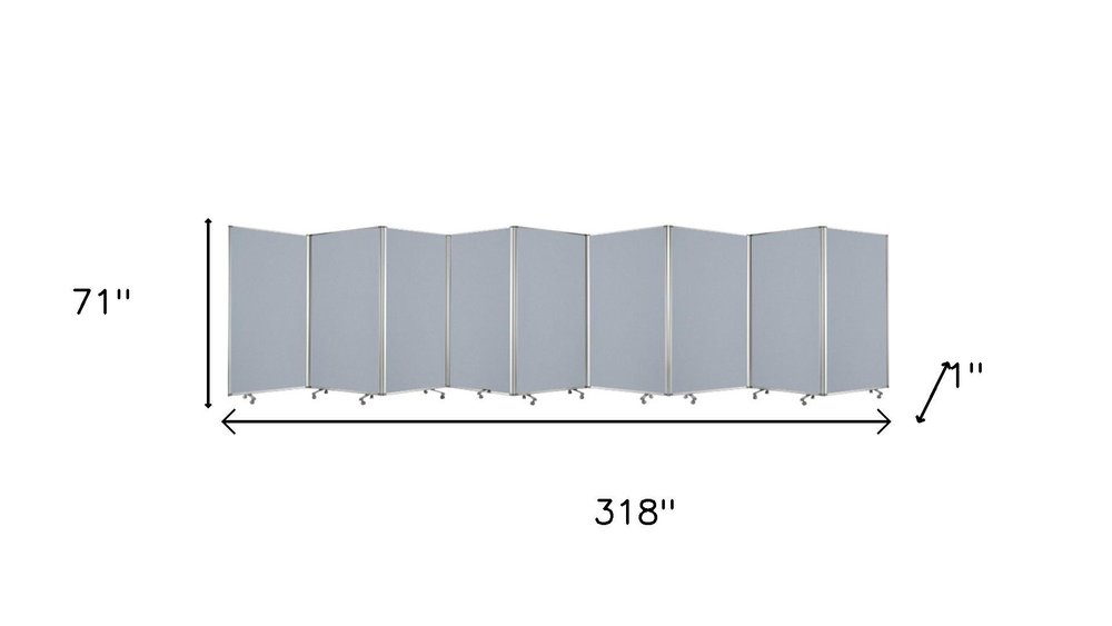 The Screen is a 9 panel accordion style room divider with wheels that can be used to easily separate your space. Includes high quality fabric finish on both sides. Easily connect several screens together to create a larger room partition. Not only is this a functional screen but it also adds some style to any room. Use your divider as a freestanding room partition, temporary wall, sound barrier and much more!
