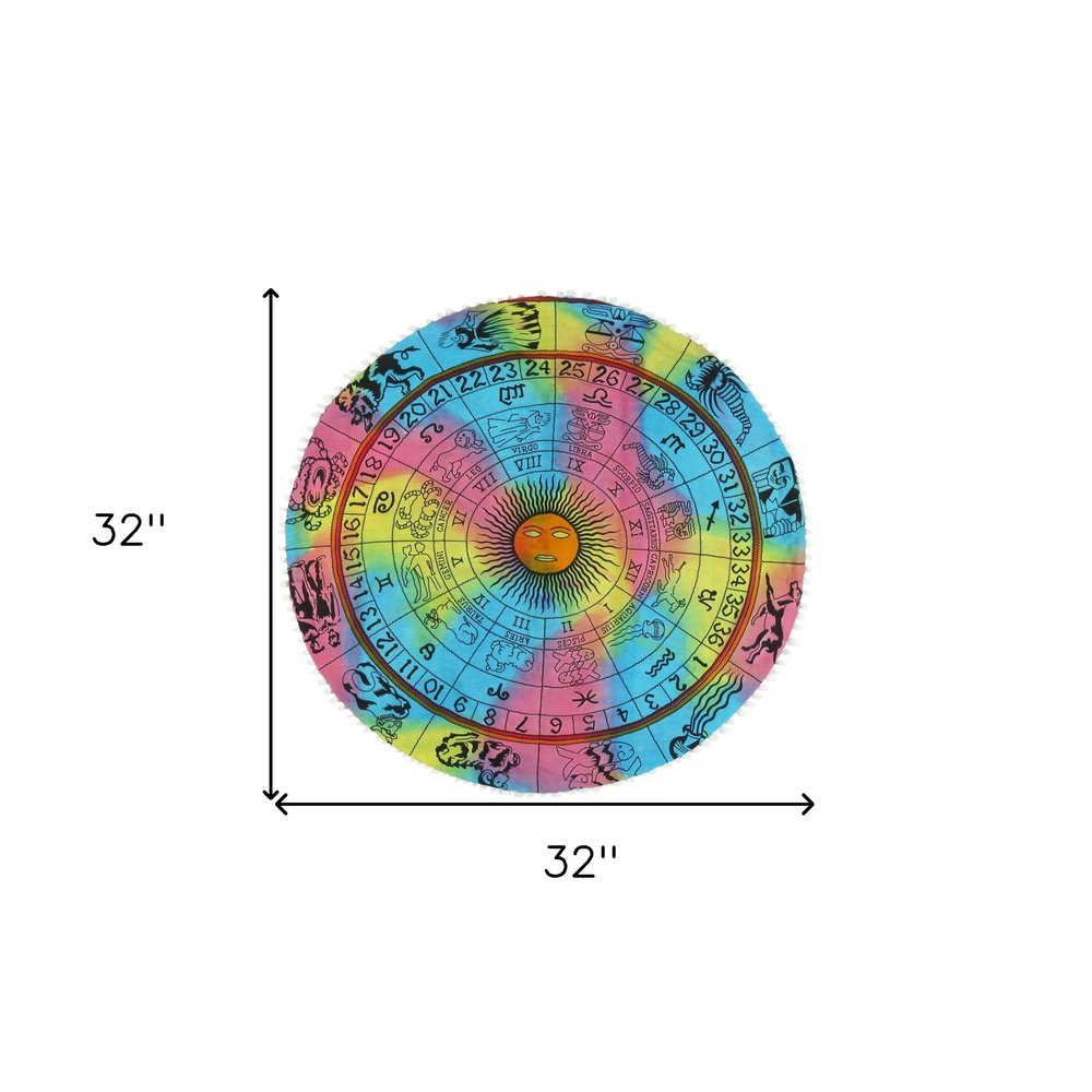 32" X 32" Blue And Pink Round Horoscope Fabric Floor Throw Pillow Cover with Pompoms