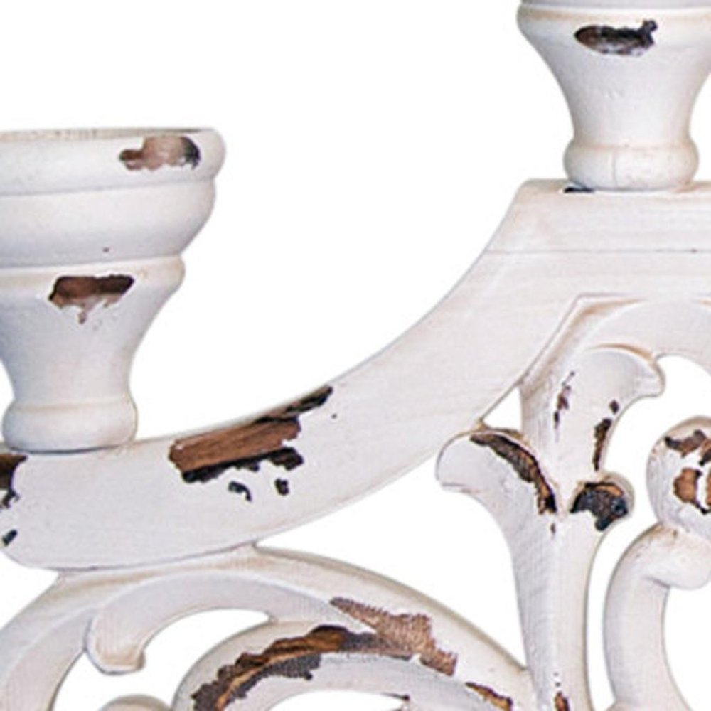 Set the night aglow with help from this gorgeous white distressed wood five light tabletop candelabra. With or without candles, this fabulous tabletop candelabra is heavily distressed and ready to add a farmhouse vintage vibe to your space. Display your pillar candles in rustic style with this special scrollwork wood candelabra. 34.45-inch h x 18.90-inch w x 6.30-inch d.