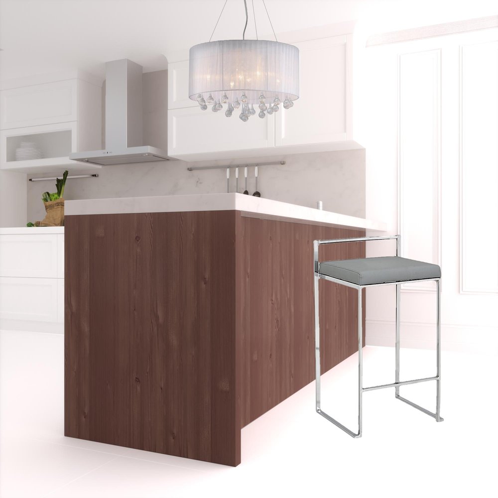 This 35" gray faux leather and steel low back bar height chair with footrest will be the perfect way to add some cool design and utility to your space similar to what you find in your favorite cafes or pubs. The base of this stool is made from steel in a chrome color that is a nice contrast to the gray faux leather seat. The bucket shape of the seat combines with a low back to give this chair a comfortable and fashionable look. Designed with a footrest for comfort and convenience. 34.75" H x 19.125" W x 18" D