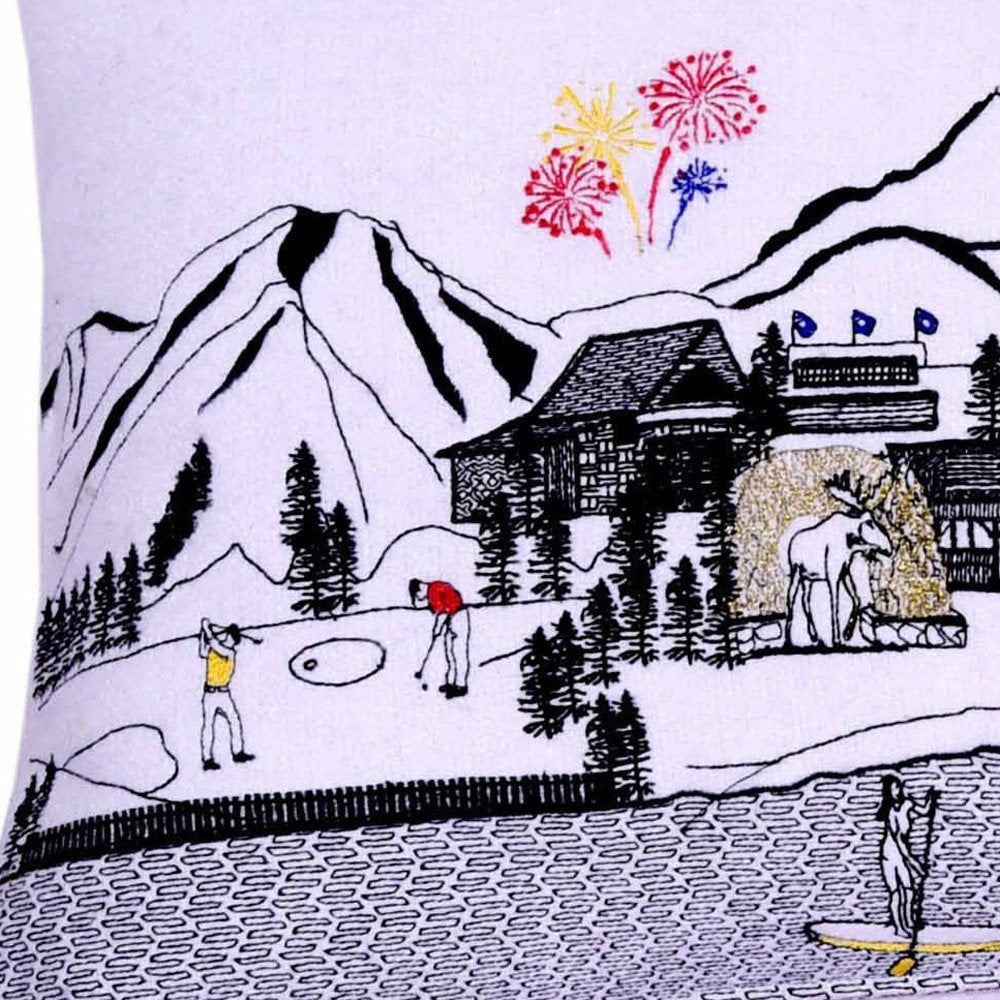 Showcase this famous city, with our Jackson Daylight Skyline Queen Size Lumbar Decorative Pillow. The daylight view of Jackson, is picture perfect. The gorgeous art features many famous landmarks and references for this destination city, rendering a modern whimsical way to bring this iconic cityscape to life. Made of a wool/nylon blend, this high quality stitched decorative pillow features black on white embroidered artwork mixed with pops of color that highlight important and recognizable icons from this popular Wyoming city known for its outdoor sports. This pillow makes a great gift, decorative accent and conversation piece. 14-inch H x 35-inch W x 4-inch D