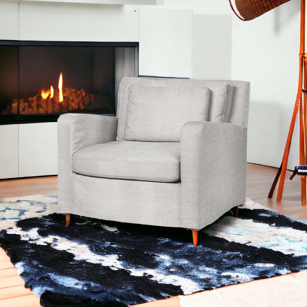 A mix of form and function, this 38-inch light gray and brown linen arm chair will bring a good looking and usable accent to your space. This gorgeous solid color light gray arm chair is masterfully upholstered in durable linen. The sturdy inner frame is built with high quality solid wood, includes armrests, and features a cushion back that is accented with soft and comfortable cushioning. 34.84-inch h x 38.18-inch w x 38.42-inch d.