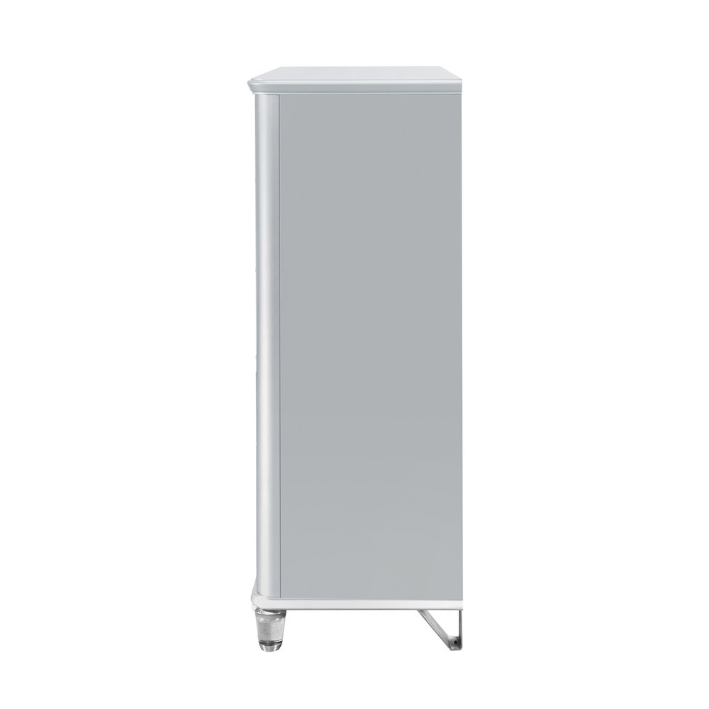 Make your room functional and visually enticing with this masterful 38-inch silver wood five drawer dresser. This vertical standard dresser has a convenient and wide top area for your getting ready needs and supplies. Equipped with five easy open drawers for practical and good looking clothing storage. This dresser will bring some modern and contemporary vibes to your room. 50.00-inch h x 37.99-inch w x 17.52-inch d.