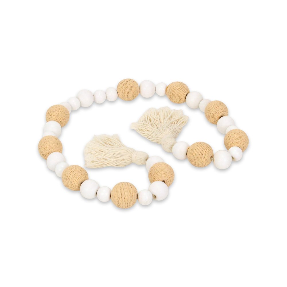 Add an air of fashion to your room and rejuvenate the space with this 38-inch white and natural wood and fabric hand painted decorative tassel. The design and natural coloring of this high quality garland will lend a casual coastal, even Bohemian design sense to your space. This charming and versatile decor can be used as a tabletop decorative accent and can also be hung or strung. It's a perfect addition for those who love an up-to-the-minute look and feel 2.00-inch h x 38.00-inch w x 2.00-inch d.