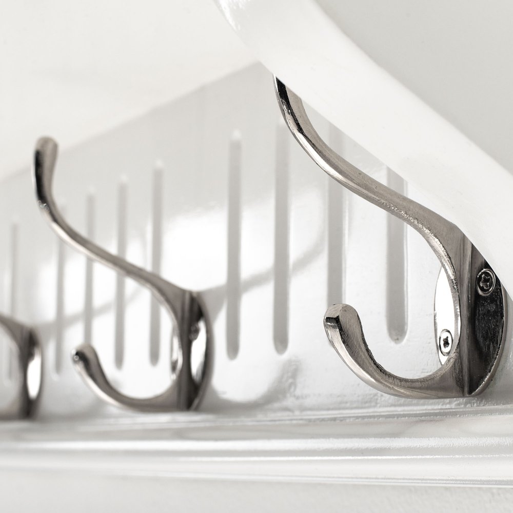 The 39-inch white solid wood six hook wall mount coat rack is the perfect addition to your living room for keeping coats organized. Designed in a coastal style, this coat rack combines functionality with a charming aesthetic. Its striking white finish enhances any decor, adding a touch of brightness to your space. Featuring six sturdy hooks, it provides ample room for hanging jackets, bags, and accessories without cluttering your entryway. The wall-mounted placement ensures that you can maximize floor space while creating an eye-catching focal point. Elevate your home organization with this elegant and practical coat rack that complements both casual and sophisticated interiors. 7.87-inch h x 39.37-inch w x 8.27-inch d.