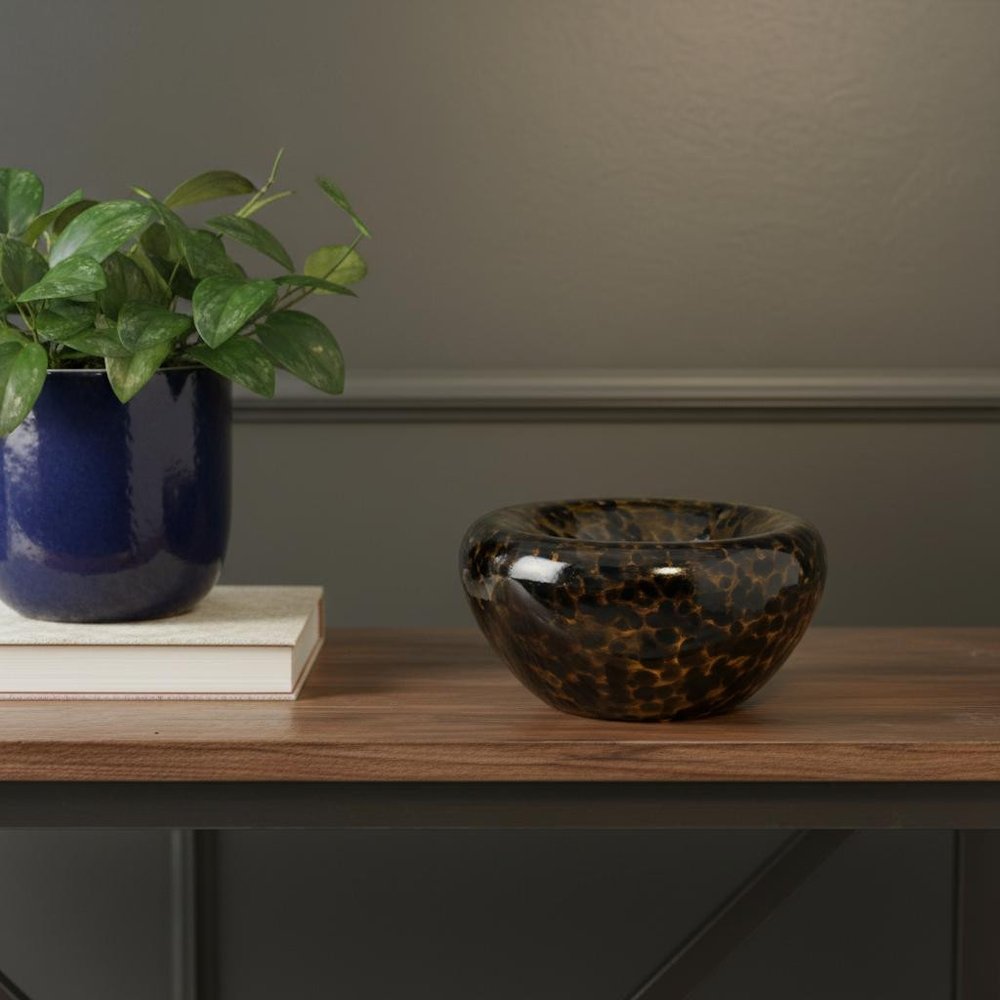 The 4-inch beige brown and black animal print round glass table vase is a striking addition to any decor. This round vase boasts a unique animal print that adds a touch of elegance and playfulness to your space. Crafted from high-quality glass, it ensures durability while showcasing its artistic design. The transitional style makes it versatile enough to complement various interior themes, from modern to traditional. Perfect for holding fresh flowers or as a standalone piece, this vase enhances your tabletop aesthetics. Its compact size allows for easy placement on shelves, desks, or dining tables, making it a functional yet stylish choice for enhancing your home atmosphere. 4.3-inch h x 8.4-inch w x 8.4-inch d.