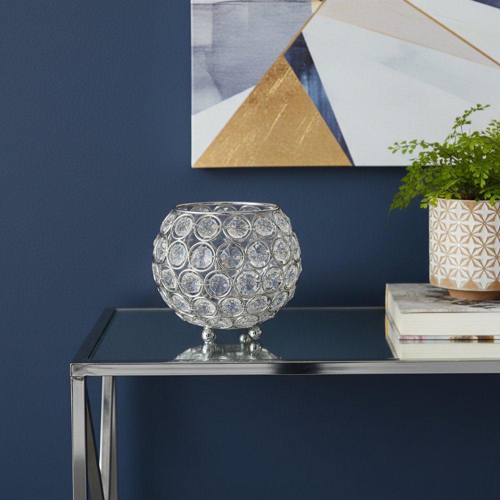 With or without flowers, this 4-inch clear and silver faux crystal and metal round table vase makes a great gift or decorative accent for your space. The small round shape adds a modern glam touch that is ideal for displaying fresh or dried flowers. Crafted from durable faux crystals and metal, this vase is a versatile accent that can be used as more than just a vase as it combines luxurious elegance with functionality. Perfect for tabletops, shelves, or entryways, this vase effortlessly enhances the ambiance of your living space while adding a touch of sophistication. 4.25-inch h x 4.75-inch w x 4.75-inch d.