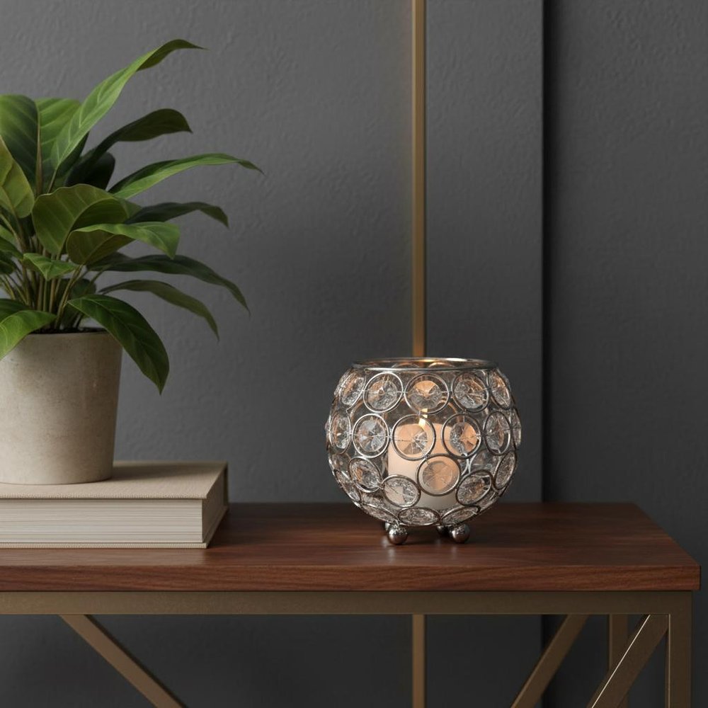 No matter where you place it in your home, this 4-inch silver geometric crystal tabletop votive is a great option for supporting the fragrant candles you love and adding a touch of charm to your home. This candleholder is the perfect illuminating design to accent your space in style. Candleholders are an attractive way to turn a simple candle into a piece of décor. 4.00-inch h x 4.00-inch w x 3.75-inch d.