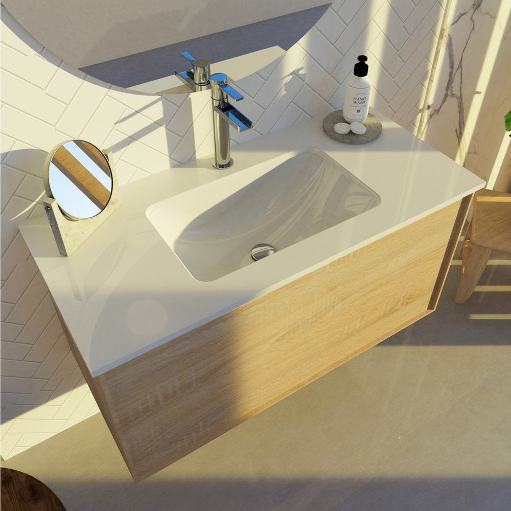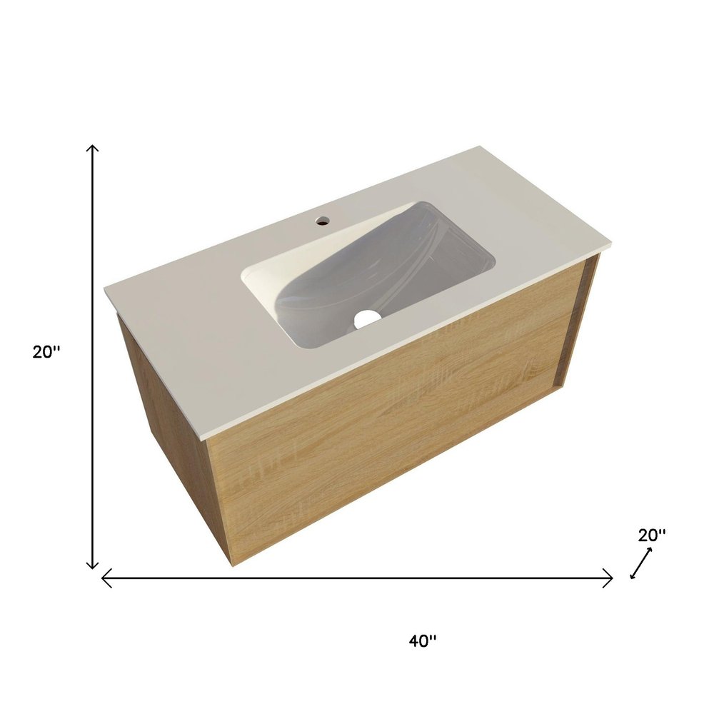 40" Oak Wood Floating Bathroom Vanity With White Sink And Two Drawers