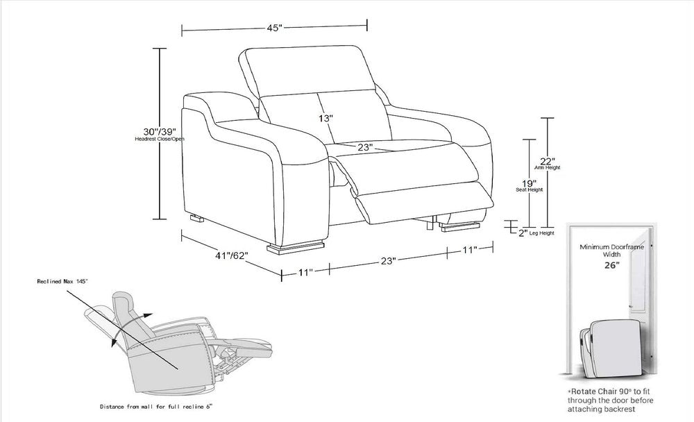 Comfortable and designed with convenience in mind, this 41-inch beige Italian leather wall hugger recliner with USB has everything you are looking for. Upholstered in high grade, Italian leather, this chair will provide a soft and luxurious way for you to relax and rest. The power push button mechanism will allow you to smoothly adjust to your most comfortable position. A space-saving option, this wall hugger recliner can be installed in close proximity to the wall because it requires minimal clearance. From morning coffee to evening tv/movie nights and everything in between, this cozy chair will be a welcome addition to your rest and relaxation routine. Recliners are a comfortable and practical option for living room, family room, den, bedroom, or nursery. 42-inch h x 41-inch w x 41-inch d.