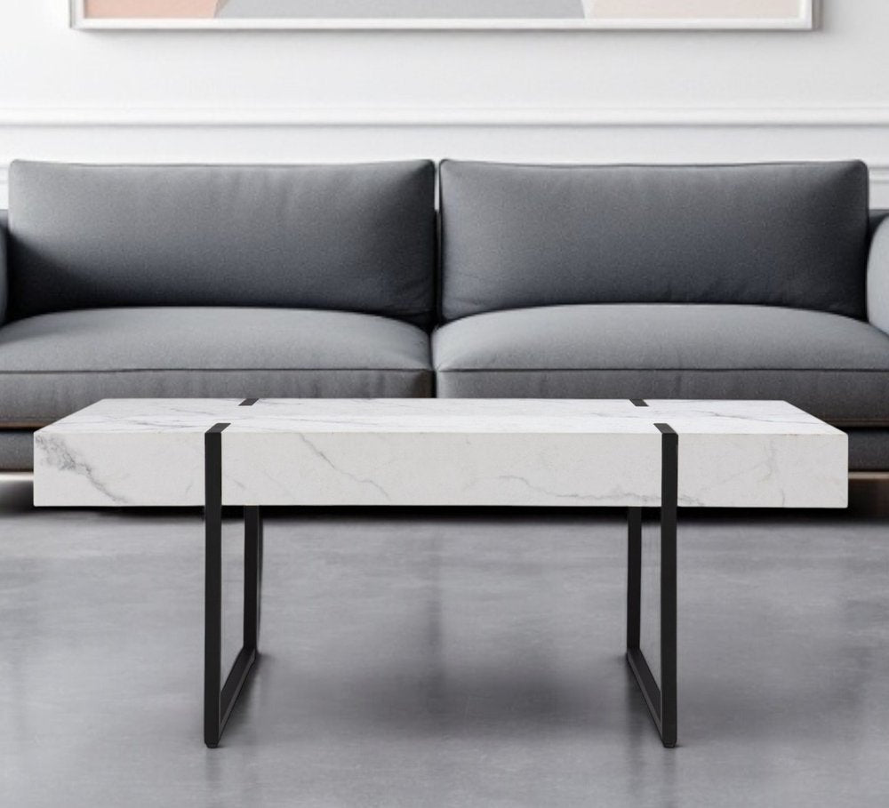 Make a statement with the 43-inch white and black faux marble and metal with iron coffee table and infuse a dash of character and personality into your space. The white faux marble top of this table is a nice visual contrast to the high quality, black metal of the base. This classic rectangular table will be a great accent in any room if you're looking for something that can fit into a living area, bedroom, or office, this coffee table is for you. This coffee table is the sturdy, reliable and stylish answer to your living room needs. 17-inch H x 43.25-inch W x 23.75-inch D