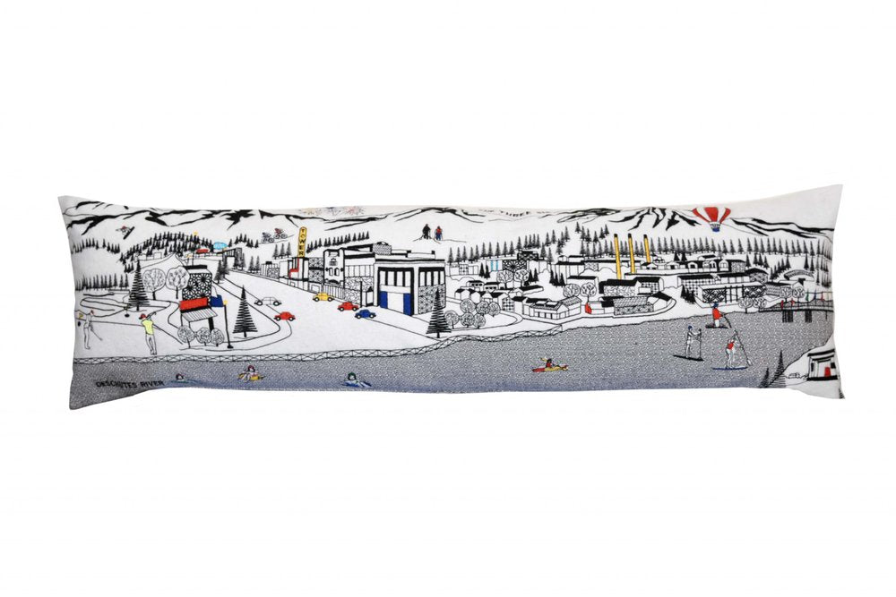 Showcase this famous city, with our Bend Daylight Skyline King Size Lumbar Decorative Pillow. The daylight view of Bend from the mighty Deschutes River that runs through it, is picture perfect. The gorgeous art features many famous landmarks and references for this destination city, rendering a modern whimsical way to bring this iconic cityscape to life. Made of a wool/nylon blend, this high quality stitched decorative pillow features black on white embroidered artwork mixed with pops of color that highlight important and recognizable icons from this popular Oregon city. This pillow makes a great gift, decorative accent and conversation piece. 14-inch H x 46-inch W x 4-inch D