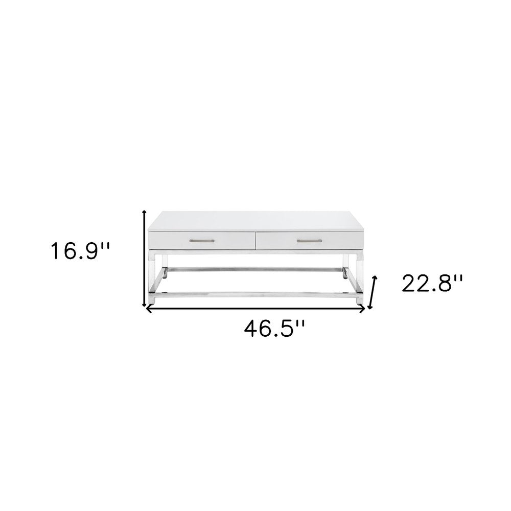 Give your living room, bedroom, or office the perfect anchor piece with this 47-inch black gold and clear wood acrylic and steel coffee table with two drawers. The high gloss black manufactured wood top of this table is a nice visual contrast to the high quality, gold and clear acrylic and steel of the base. Two drawers give you concealed storage that is great for the remote, magazines, mail and other accessories. This rectangular table is an classic yet stylish and updated way to accent your room. 16.9-inch H x 46.5-inch W x 22.8-inch D