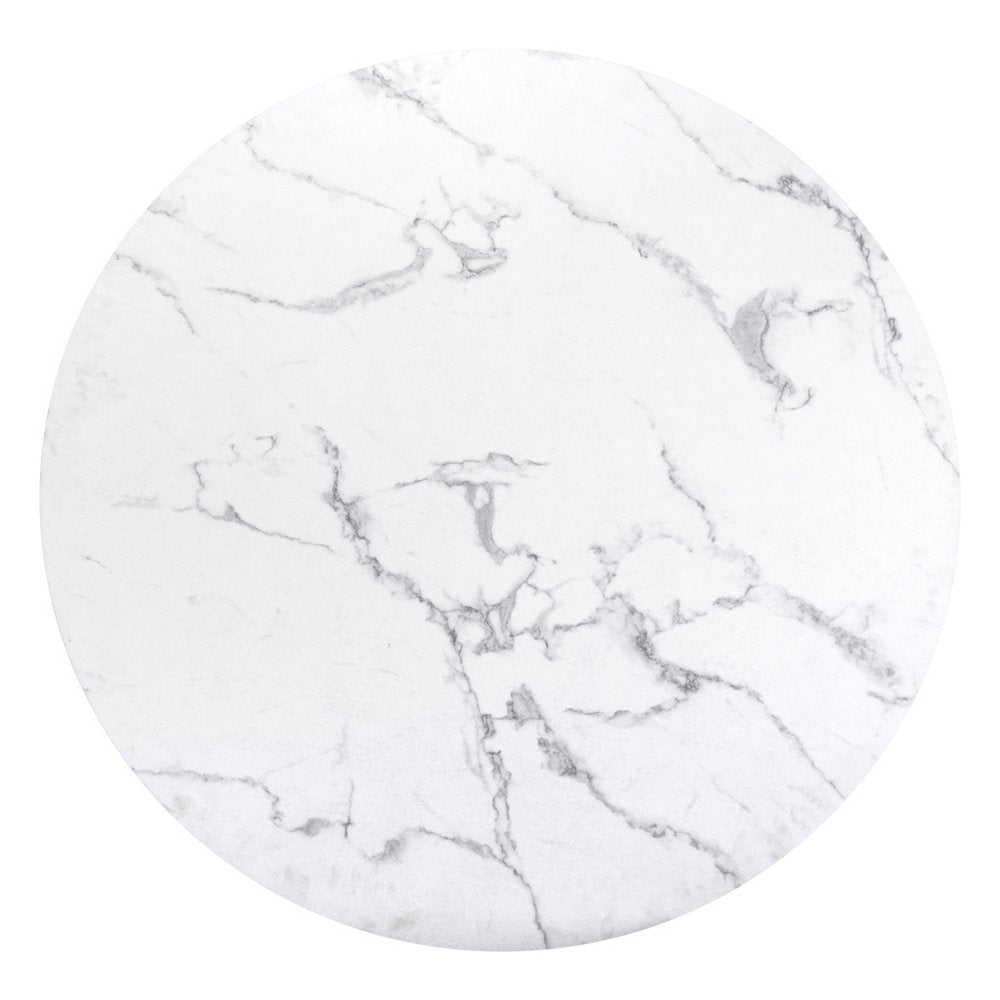 Add handsome, fashionable design to your dining space with this 47" white and black rounded manufactured wood and steel dining table. The base of this table is made from steel in a black color that creates a good looking visual contrast to the white manufactured wood laminate tabletop that features a marble print. The two-tone finish is attractive and fashionable. Seat up to 4 family and friends around your new dining table. Complete your kitchen or dining room with this well made and stylish table. This eye-catching dining table is ready for you to enjoy breakfast for one or entertain your guests. 29.9" H x 47.2" W x 47.2" D