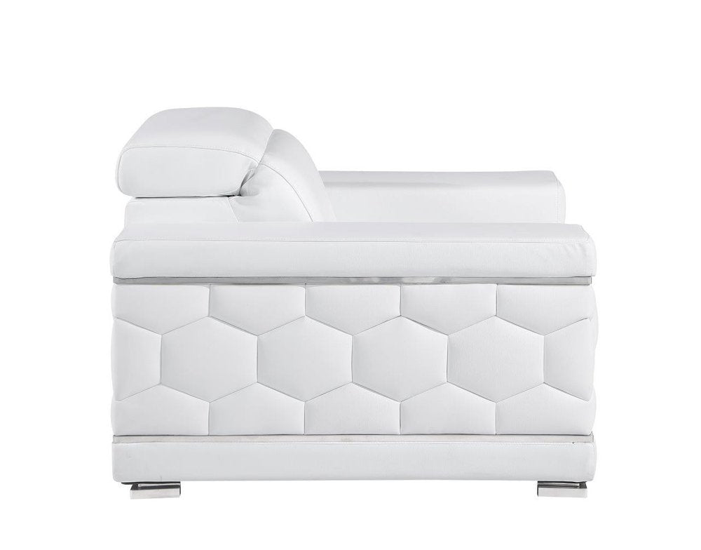 This 47-inch white and silver genuine leather club chair will add a beautiful decorative accent to your decor. Built to last this club chair is finished in solid white genuine leather to give your room a great update. Giving the chair stability and structure, the inner frame is constructed with high quality solid wood, includes comfy armrests, and features a tight back that comes complete with soft and comfortable cushioning. 39-inch h x 47-inch w x 41-inch d.
