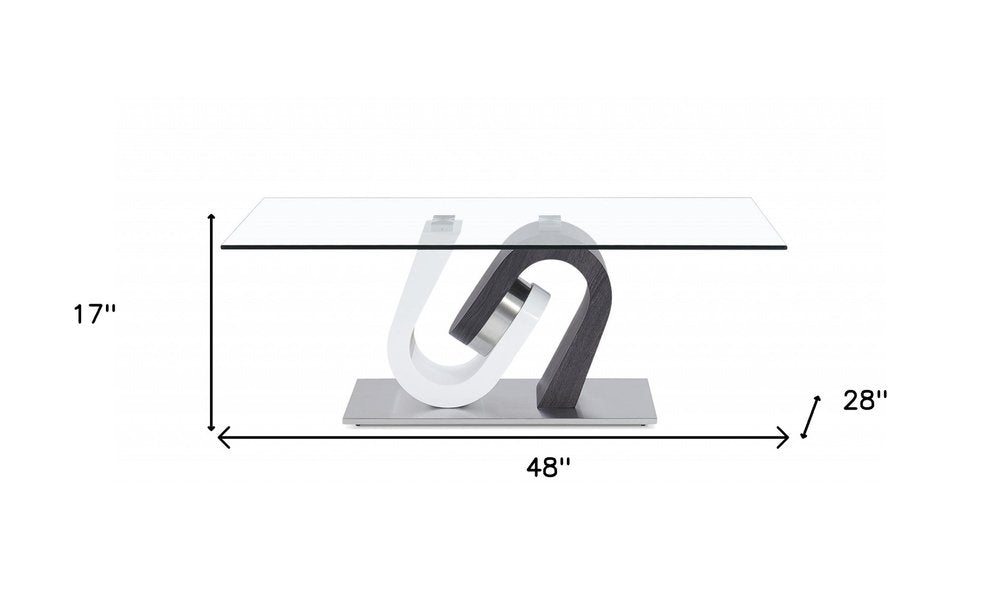 Give your living room, family room, or office the perfect anchor piece with this 48-inch clear, gray, and white glass and steel mod coffee table. A unique abstract design gray and white steel frame is finished off with a clear glass top that is the epitome of quality construction and design. This contemporary rectangular table will be a great accent in living room, bedroom, or office. 17-inch H x 48-inch W x 28-inch D