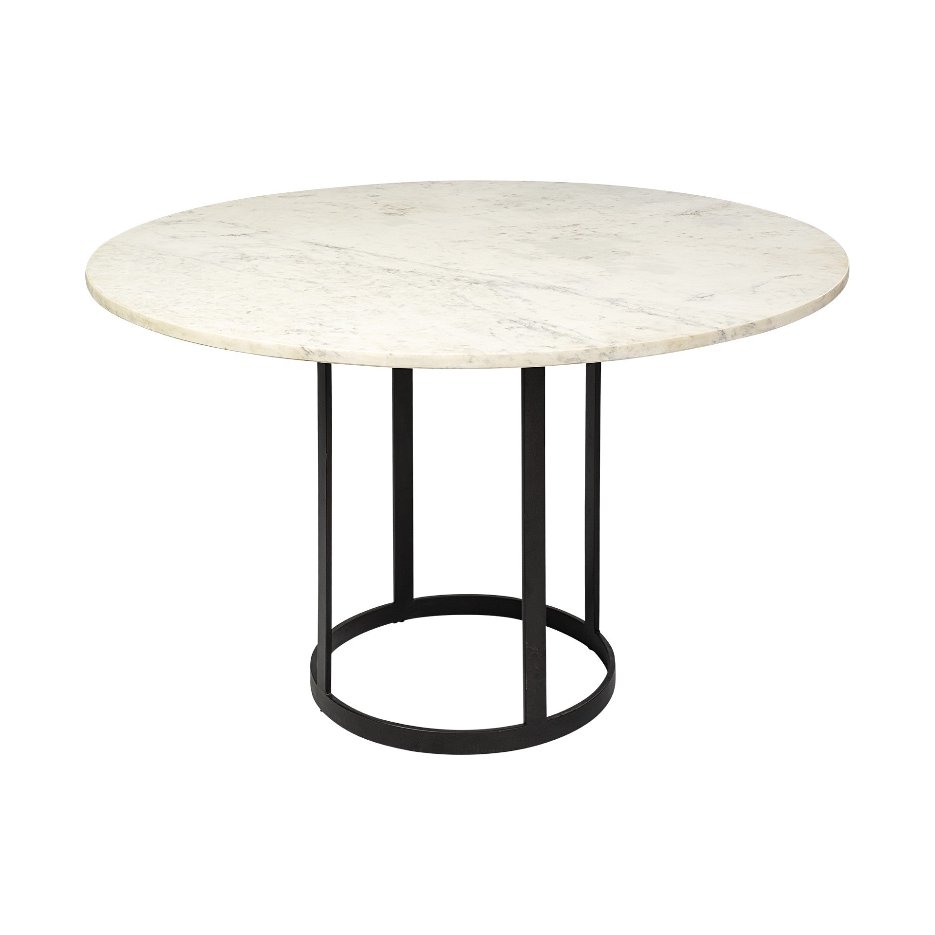 Add handsome, fashionable design to your dining space with this 48-inch white and black rounded marble and metal pedestal base dining table. The base of this table is made from metal in a black color that creates a good looking visual contrast to the white marble tabletop. The two-tone finish is attractive and fashionable. This table features a pedestal base that adds some depth and interest to your space. Seat up to 2 family and friends around your new dining table. This table is the sturdy, reliable and stylish answer to your dining room needs. This eye-catching dining table is ready for you to enjoy breakfast for one or entertain your guests. 30-inch H x 48-inch W x 48-inch D
