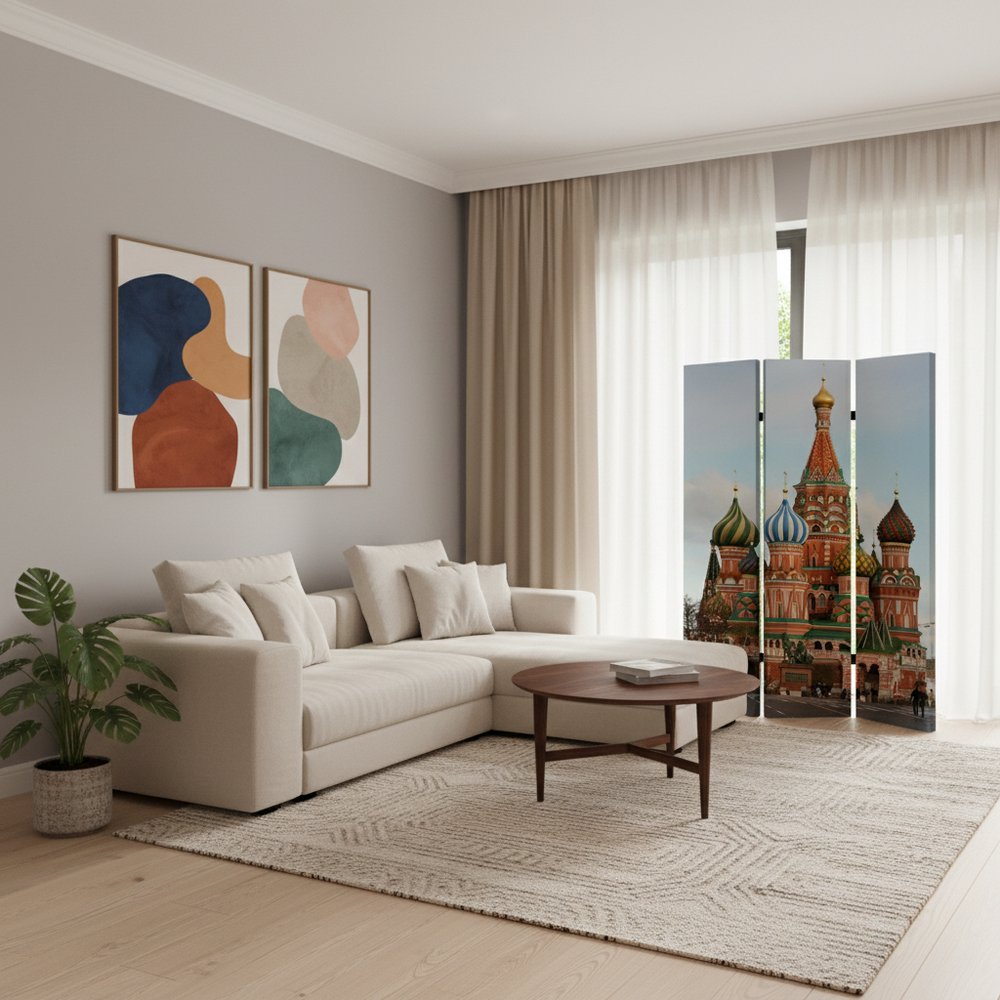 72" Red Blue And Ivory Canvas Folding Three Panel Screen Room Divider