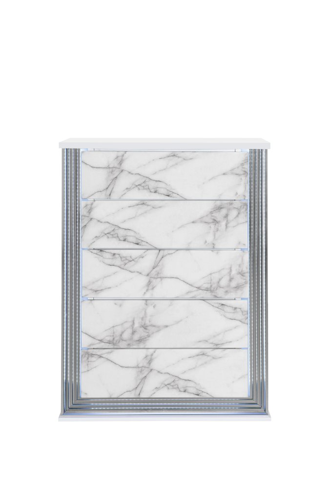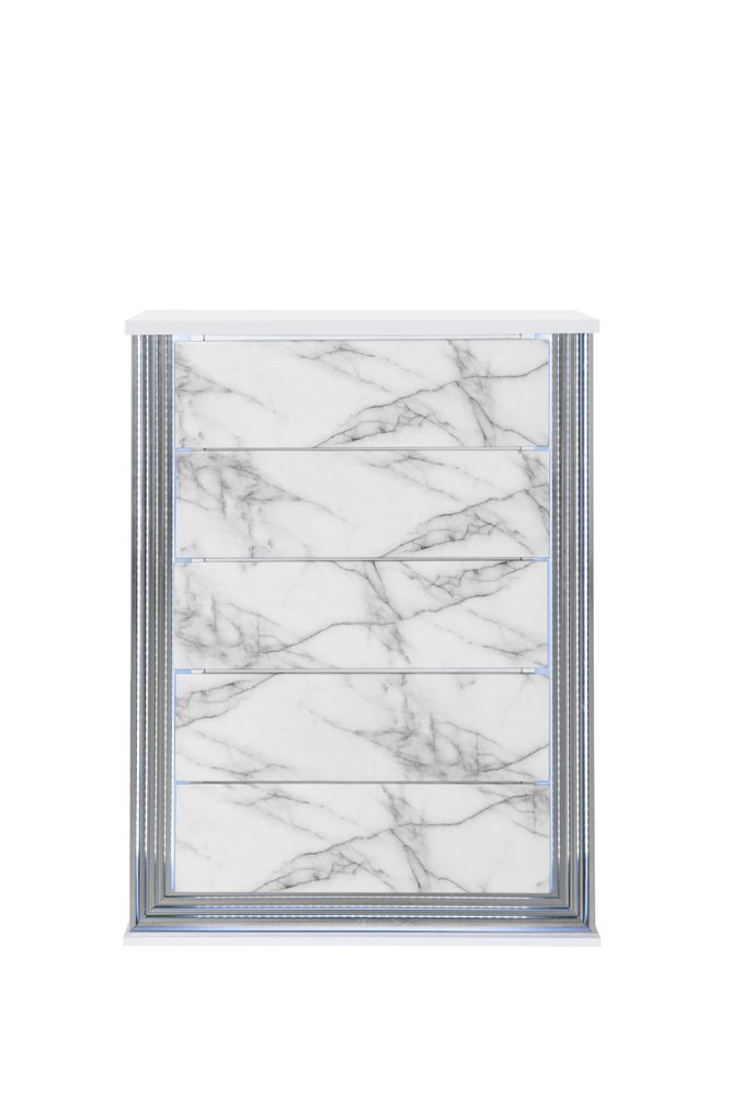 Enhance your room into a visually delightful and highly functional space with this 49-inch silver and white wood five drawer dresser. This vertical standard dresser has a convenient and wide top area for your getting ready needs and supplies. Featuring a luxurious faux marble facade and LED lighting, this dresser will add some glitz and pizazz to your space. Equipped with five easy open drawers for practical and good looking clothing storage. 35.43-inch h x 48.98-inch w x 17.13-inch d.