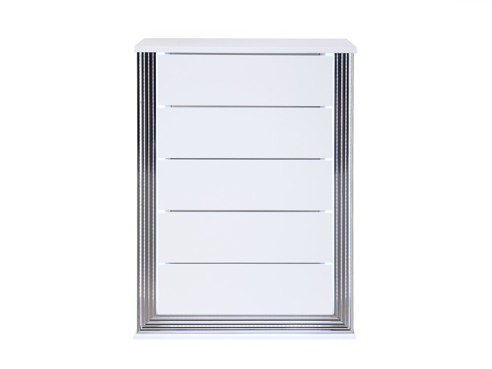Add personality to your bedroom style and a feeling of coziness with this 49-inch white wood lighted five drawer dresser. This vertical standard dresser has a convenient and wide top area for your getting ready needs and supplies. Equipped with five easy open drawers for practical and good looking clothing storage. The white coloration of this piece is neutral and will blend easily with most any decor. 35.43-inch h x 48.98-inch w x 17.13-inch d.