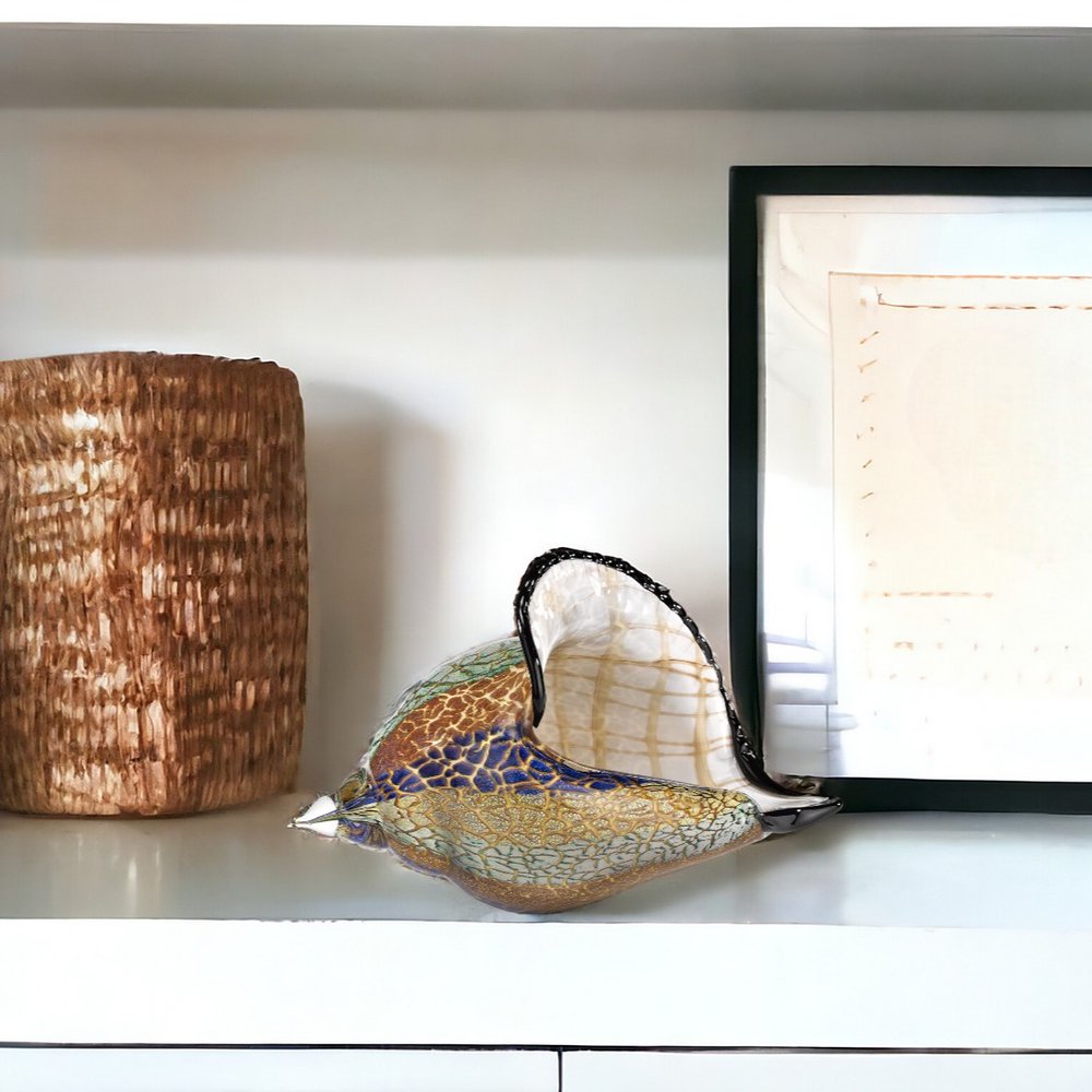 The 5-inch gold blue green white murano glass figurine tabletop sculpture is the perfect decorative accessory for your home. The gold blue green white coloring of this high quality murano glass accent will look great in most any space. A perfect decorative addition for anyone who loves a stylish look and feel. 5-inch H x 8-inch W x 4-inch D