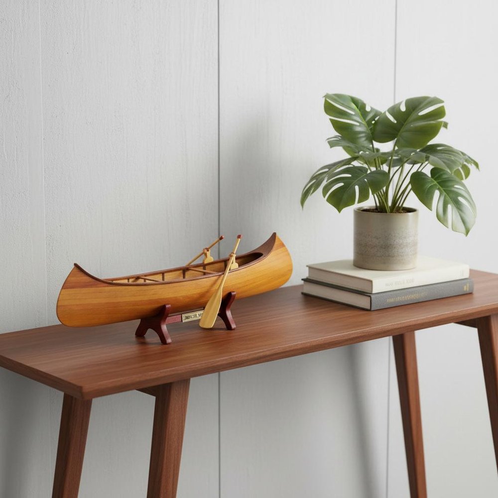 The famous canoe designer/builder J. H. Rushton, introduced the Indian Girl model in 1902. To quote Mr. Rushton, "The Indian Girl is strong, light, safe though speedy, graceful yet seaworthy." Have this model beautifully displayed in your home or office. Master craftsmen handcraft these highly detailed wood models from scratch using historical photographs, drawings and original plan. They are built to scale with high-grade wood such as: western red cedar, rosewood, and mahogany. They are 100% hand built individually using plank-on-frame construction method and are similar to the building of actual ships. Each model requires many hours to finish and must go through a demanding quality control process before leaving the workshop. You can find the ribs inside the canoe along with the planking. The natural wood finish really brings out the character of a wooden canoe. Comes with a set of two wood paddles. This model rests on a wooden base with a brass nameplate. Itll make a perfect gift for home or office decorator, boat enthusiast, or passionate collector.