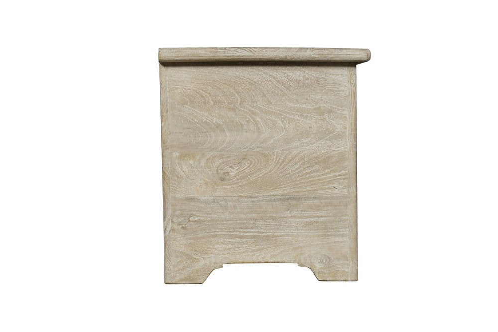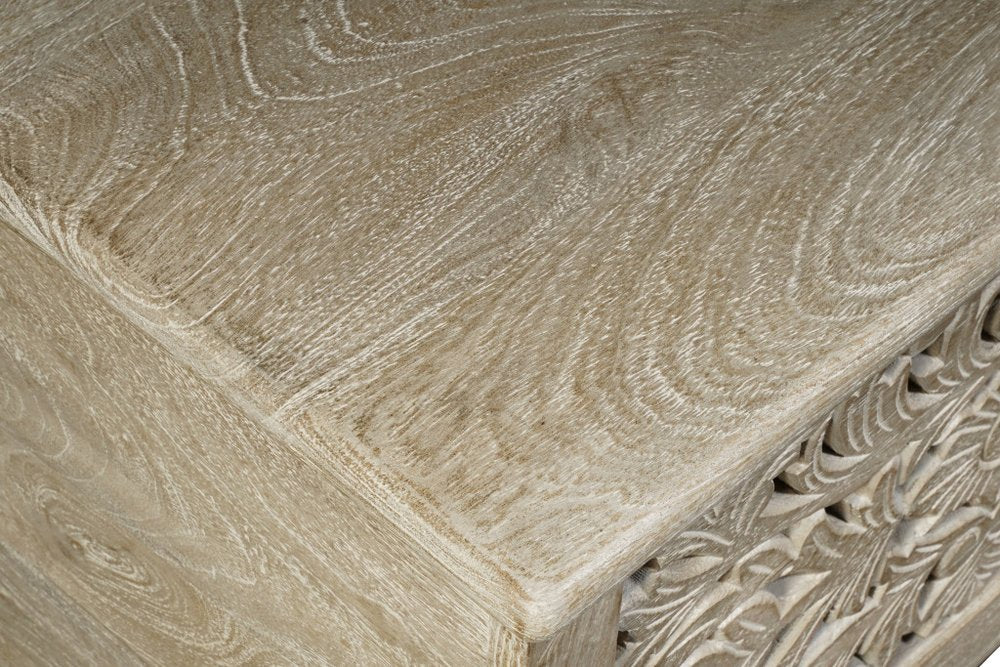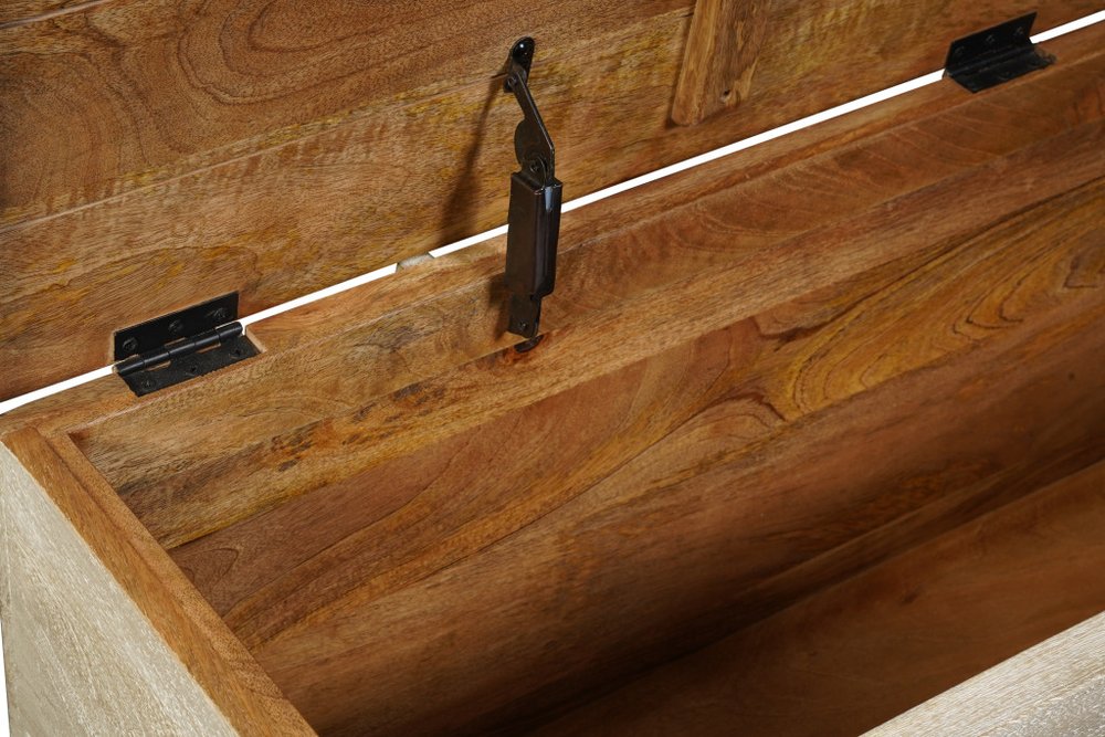 Practicality and fashion mix together with this handy 52-inch gray distressed solid wood carved floral storage ottoman. Designed to discretely add hidden storage to your room without sacrificing style, seating, or foot rest space. This multi-functional piece features quality handcrafted construction from solid mango wood that features a beautiful carved floral design. The purposefully distressed finish gives an authentically rustic feel. This versatile piece is a great way to add storage and functionality to your living room, bedroom, entranceway, hallway, or office. 18-inch h x 52-inch w x 16-inch d.