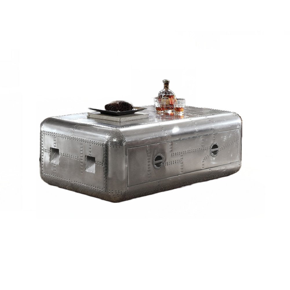 This stylish 52-inch silver aluminum solid coffee table with drawer is not only practical, but good looking and built to last. Create an inspiring atmosphere in most any room with this silver aluminum table. This rectangular table is an classic yet updated way to accent your room. If you're looking for something that can fit into a living area, bedroom, or office, this coffee table is for you. 19-inch h x 52-inch w x 31-inch d.