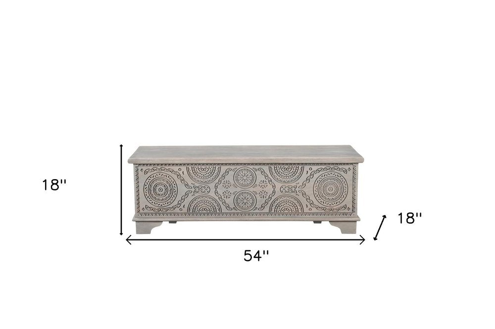 Get ready to relax with this 54-inch gray carved geo scroll solid wood storage ottoman. Designed to discretely add hidden storage to your room without sacrificing style. This multi-functional storage piece is handcrafted from high quality solid mango wood in a gray color with geometric carved detailing throughout the base and top. The purposefully distressed finish gives this versatile ottoman an authentically rustic feel. Easy to blend into most any room, a ottoman is a way to add a good looking accent to your space that can also be practical and useful. 18-inch h x 54-inch w x 18-inch d.