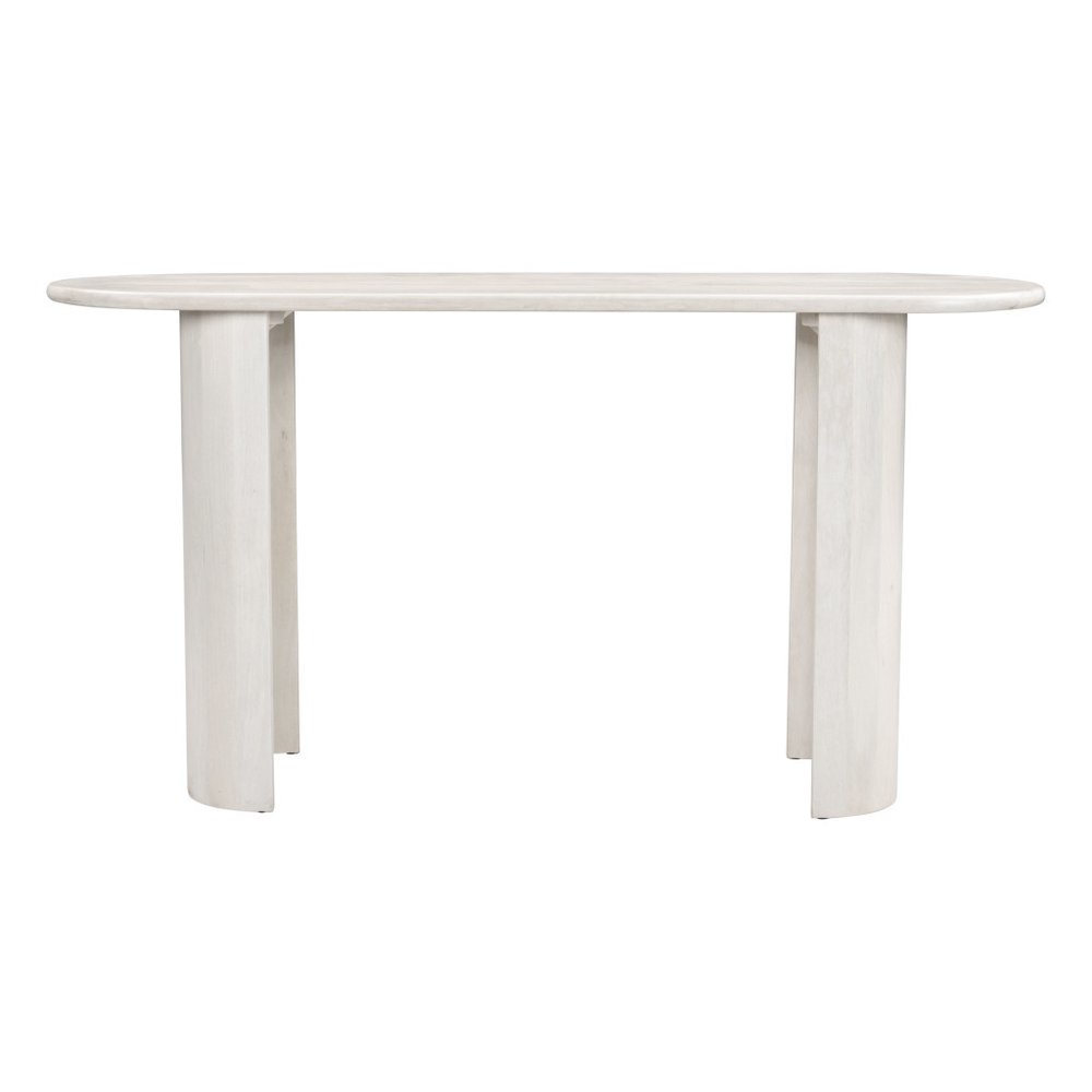 This 58-inch white solid wood oval console table can provide a variety of practical functions such as providing extra storage space, serving as a display area for decorative items or acting as a catch-all for keys, mail, and other small items. The oval shape and whitewashed bleached finish of this solid mango wood console table promotes a soft, elegant, and stylish environment. Ideal for living rooms, bedrooms, home offices, and lounge areas, this modern minimalist console table is not only good looking but multi-functional and practical addition to your space. 29.90-inch h x 58.00-inch w x 19.00-inch d.