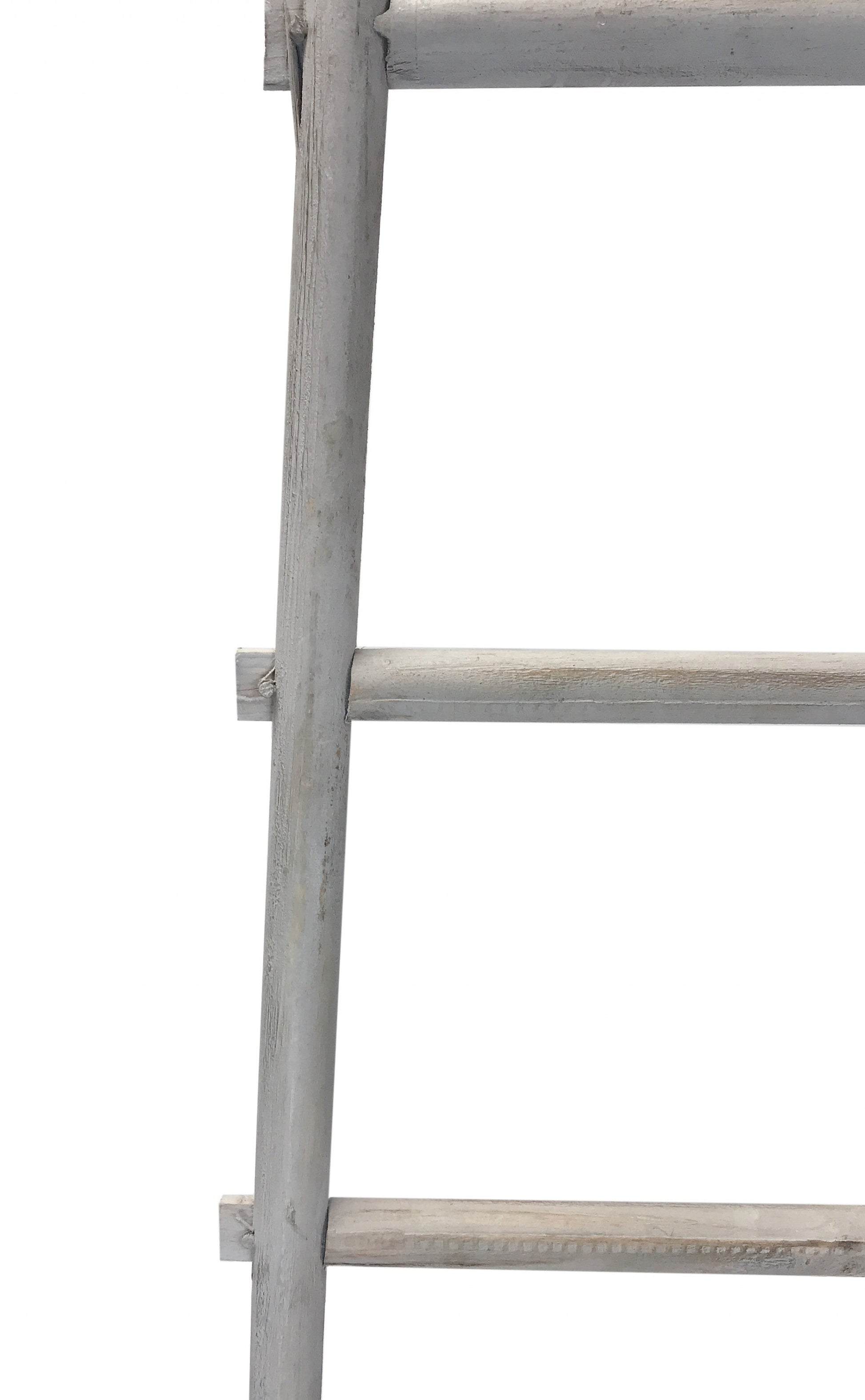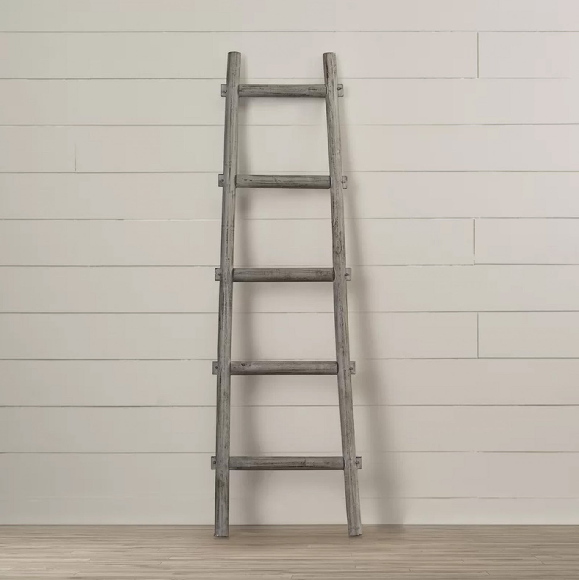 Elevate your living room decor with the 59-inch gray five step rustic weathered grey wood ladder shelf. Crafted from wood with purposeful distressing, this decorative piece brings a rustic charm to any space. The weathered grey color adds a touch of elegance and versatility, perfect to hold your blankets, towels, or other small accessories. Add a cozy atmosphere to your home with this charming rustic ladder, a perfect addition to your living room, bedroom, or hallway interior design. 59-inch h x 18-inch w x 2-inch d.