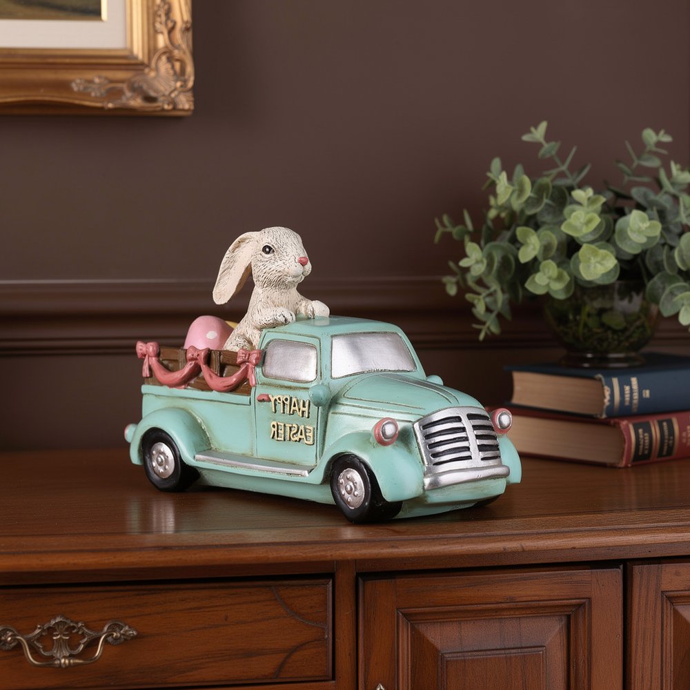 This 10-inch aqua resin happy easter bunny and car figurine adds some fun and festive easter spirit to your holiday decorating or gifting. Great to use on its own or mix with other decorations for the perfect look. Crafted with precision, this machine-made figurine captures the essence of traditional design. The vibrant resin material ensures durability while showcasing delightful details. Perfectly suited for enhancing your seasonal decor, this charming sculpture will bring joy to both children and adults alike in any space. 6.25-inch h x 9.50-inch w x 5.50-inch d.