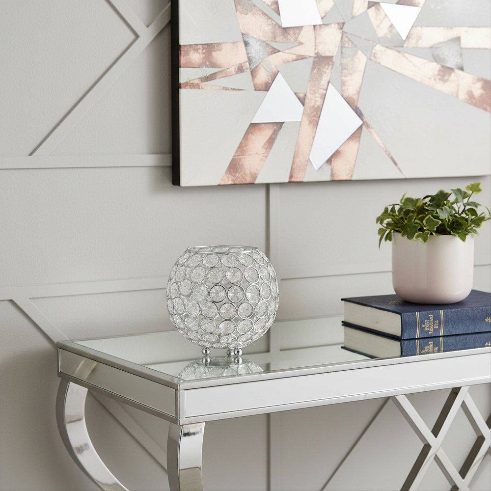 This 6-inch clear and silver faux crystal and metal round table vase is the perfect accent for your living room, bedroom, dining room, or lounge. The round shape adds a modern glam touch that is ideal for displaying fresh or dried flowers. Crafted from durable faux crystals and metal, this vase is a versatile accent that can be used as more than just a vase as it combines luxurious elegance with functionality. Perfect for tabletops, shelves, or entryways, this vase effortlessly enhances the ambiance of your living space while adding a touch of sophistication. 5.50-inch h x 6.00-inch w x 6.00-inch d.