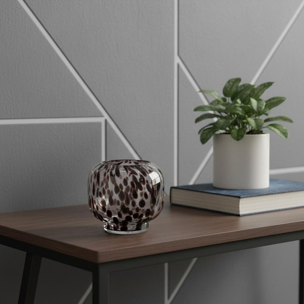 The 6-inch clear burgundy and black abstract round glass table vase is a stunning addition to any decor. Crafted from high-quality glass, this table vase showcases a captivating blend of burgundy and black hues. Its round shape creates a balanced visual appeal, making it perfect for displaying fresh or dried flowers. The contemporary style ensures it will seamlessly integrate into modern interiors, adding a touch of elegance to your space. This versatile vase can also stand out as a decorative piece on its own, enhancing the aesthetic of your tables or shelves. Elevate your home with this artistic glass vase that combines practicality and beauty in one exquisite design. 5.7-inch h x 6.3-inch w x 6.3-inch d.