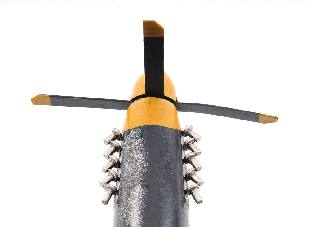 A beautiful replica of the iconic WWII American fighter-bomber, the c1943 Grey Mustang P51 Sculpture is handmade out of metal and accurately detailed. It comes with remarkable details such as landing wheels, a cockpit, and a propeller and is painted with authentic WWII paint and symbols. With a scale of 1:40, it is a sought-after piece for aviation and WWII enthusiasts.5.5-inch H x 13.5-inch W x 12.25-inch D