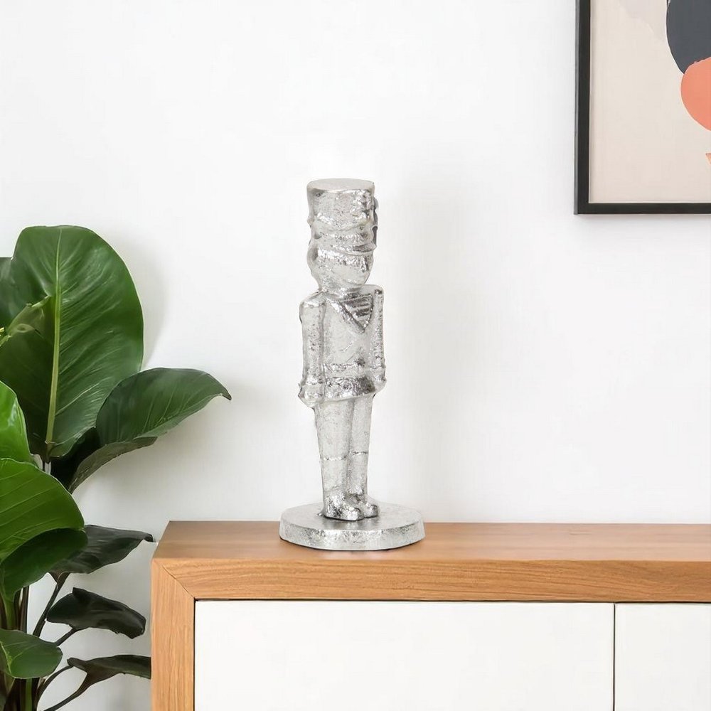 Set a festive christmas mood with this 6-inch silver cast iron christmas nutcracker hand painted figurine. A perfect decorative addition for anyone who loves a stylish look and feel. This handmade sculpture showcases exquisite craftsmanship, making it a standout piece for holiday decor. The intricate detailing of this figurine enhances its visual appeal, embodying the spirit of the season. Constructed from durable cast iron, it combines both artistry and longevity, ensuring it will be a cherished part of your holiday traditions for years to come. Its purposeful distressing adds character and charm, making it a delightful conversation starter. 5.50-inch h x 2.25-inch w x 2.25-inch d.