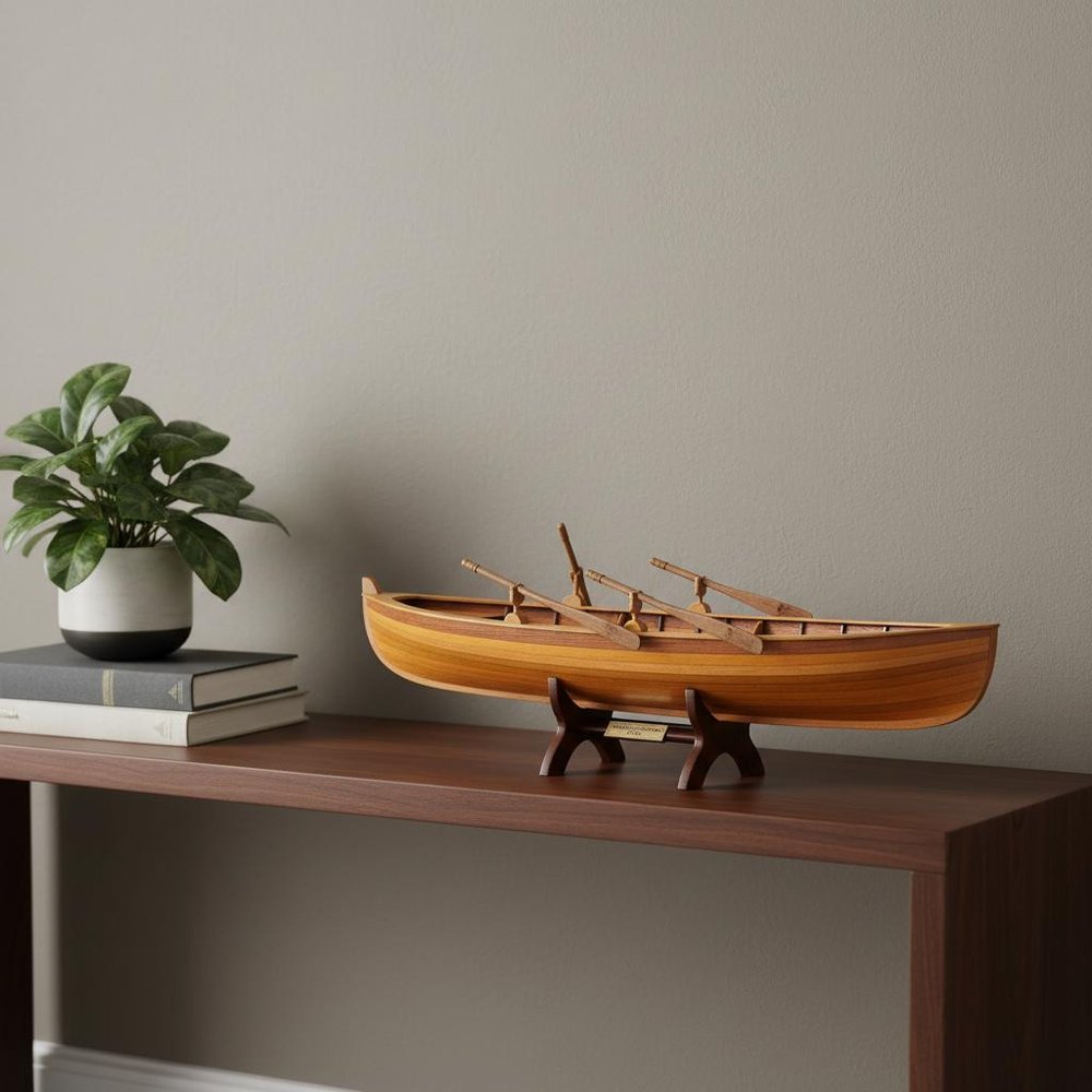 It is a FULLY ASSEMBLED replica of a Boston Tender, a classic rowing boat believed to have originated along the New York waterfront in the early 1800s. It looks and feels like a miniature real boat. This 24.5-inch model is strip built from the highest quality of woods by master artisans using plank on frame construction, just like real boats. Each model takes more than 50 hours to construct and undergoes a demanding quality-control process. Among the details of this boat model: interior ribs, four oars, oar holders, seats, brass nameplate and stand. The boat is wood, through and through!