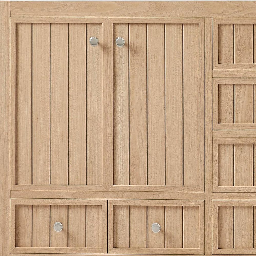 The 60-inch natural wood double bathroom vanity with white and gray quartz countertop seamlessly combines modern elegance with functional design. Its stunning quartz countertop features a pearly white color with light gray marbleized veining that complements the natural color of the manufactured wood base. Equipped with two undermount sinks made of durable ceramic, it offers ample functionality for busy mornings. The six functional drawers provide generous storage and feature soft close door hinges that add to the refined touch. The brushed nickel metal drawer pulls and bead board texture complete the stylish aesthetic. This vanity comes assembled and strikes the perfect balance between practicality and fashionable style in your bathroom. 35.00-inch h x 60.00-inch w x 22.00-inch d.