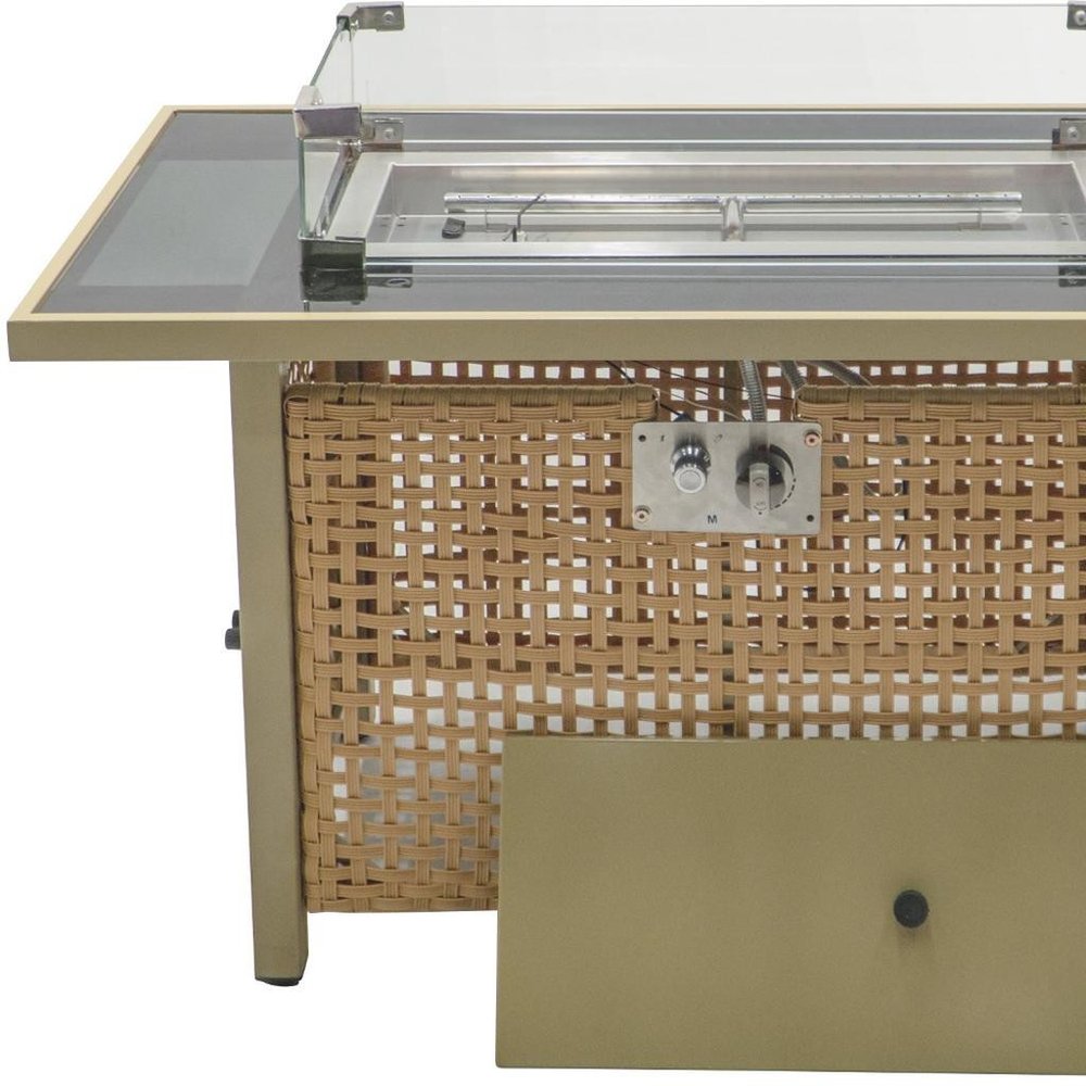 Whether you're roasting marshmallows or just enjoying the warmth of the flames, this 60,000 BTU 43-inch natural and black steel and wicker propane fire pit table with cover is a must-have for any outdoor enthusiast. This rectangular fire pit table is extremely versatile, as it is a stylish firepit table or can be used with the cover as a coffee or accent table. Made of sturdy steel and natural colored woven faux wicker that is lightweight and durable. Easy to cleanup without messy soot or ash, this propane firepit includes a glass wind guard. If you are looking to impress your guests, you can easily show them this neat adjustable flame feature. Fire features are a great way to enjoy the outdoors with your friends and family. 25.00-inch h x 43.00-inch w x 22.10-inch d.