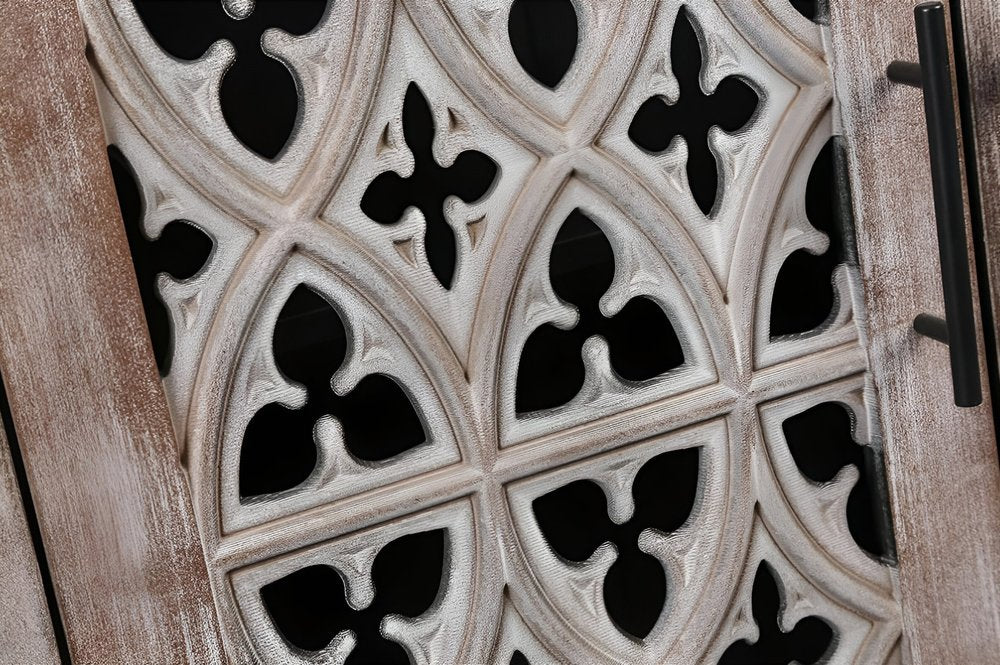 Storage vessels don't have to be unsightly. Increase your storage space and the fashion quotient of your room with this hard-wearing, versatile, and good-looking sideboard. Crafted from manufactured wood, this modern-style piece features coat/paint distressing for a stylish look. The sideboard boasts open storage with shelves included, perfect for displaying your favorite decor pieces. The rich brown color and intricate carved scrollwork detailing on the wood scrollwork doors add a touch of elegance to your living space. Ideal for both storage and visual appeal, this sideboard is a must-have for any home. 32.3-inch H x 62.75-inch W x 15.6-inch D