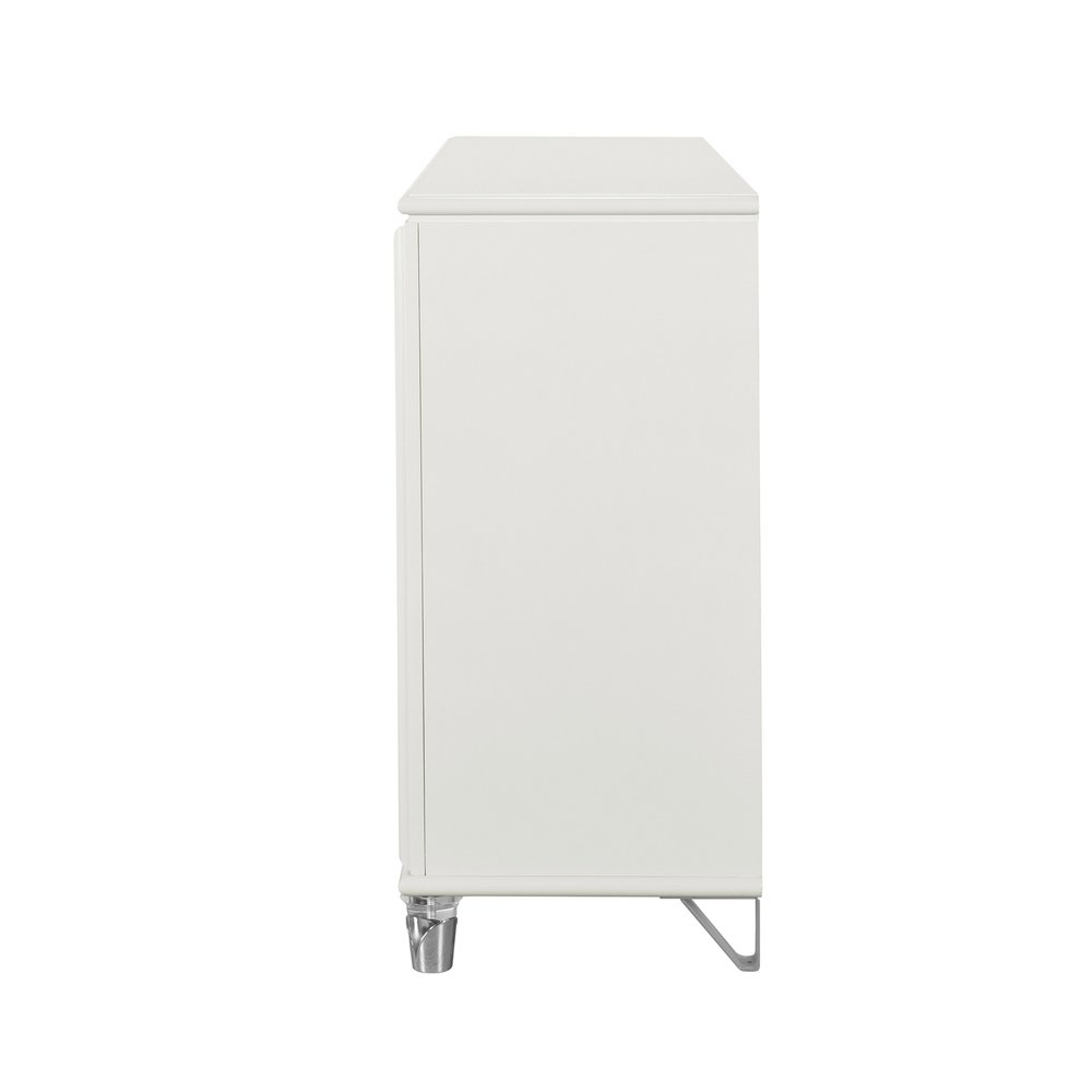 Enhance your room into a visually delightful and highly functional space with this 63-inch white wood with gold faux crystal bling six drawer double dresser. This horizontal double dresser has column style drawers and a wide top surface area to help you with your daily dressing essentials. Loaded with capacity, this piece is equipped with six easy open drawers for practical and good looking clothing storage. The gold inlaid accents on the drawers give this dresser a glamorous and striking finish. 38.98-inch h x 63.39-inch w x 17.80-inch d.