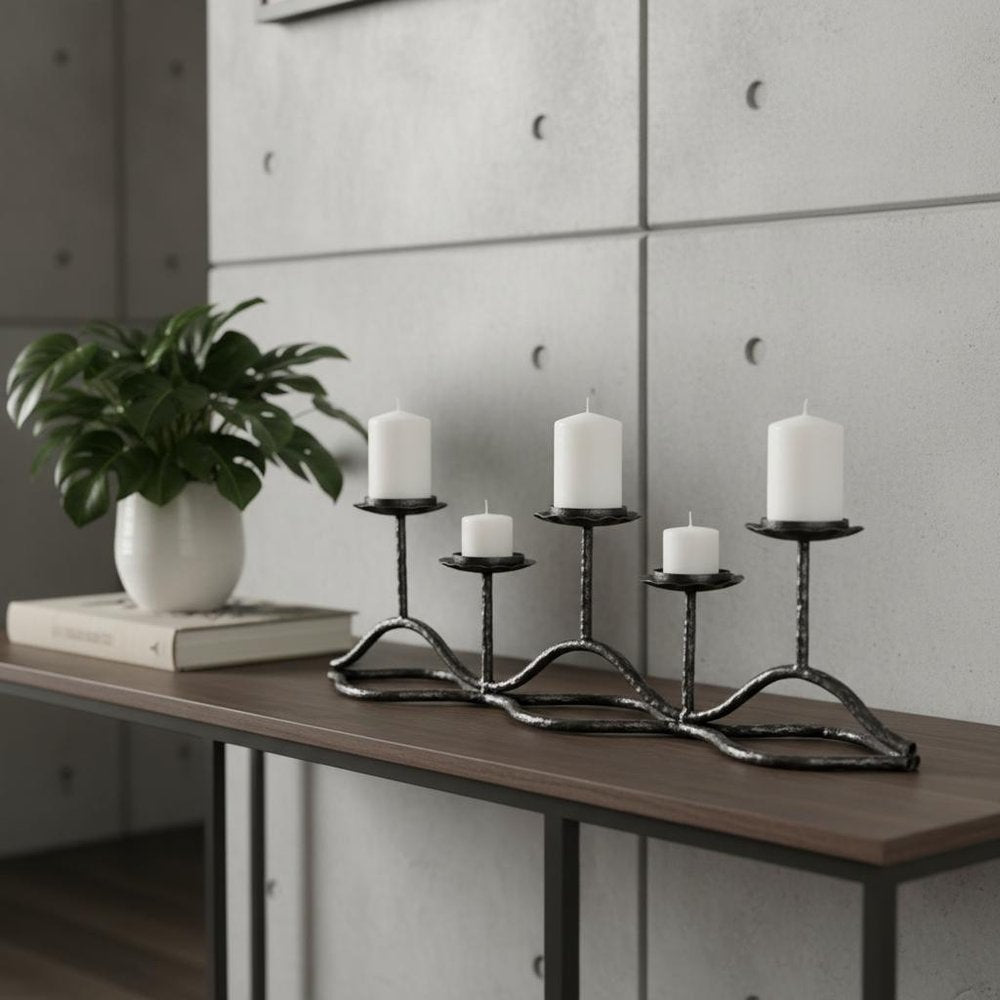 This 7-inch black distressed geometric metal tabletop tealight candle holder is perfect for placing on dining room tables or living areas for an effortless ambient aesthetic. Handmade by skilled craftsmen and designed to add a glamorous glow to any event or table setting. This candleholder is the perfect illuminating design to accent your space in style. Candleholders are a decorative accent on their own. With our without candles. 6.5-inch h x 21.75-inch w x 4-inch d.