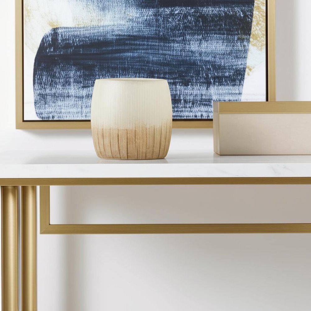 Add a touch of minimal design to any space in your home with this White and Gold Ombre Striped Long Glass Vase. This vase is made of glass and has a wide and long cylindrical shape with a flat base. There is a striped pattern on which is accentuated more by the white and gold ombre finish that sits on top of the vase. Smooth to the touch in a glossy finish this unique coloration of the glass makes this a great accent to use by itself or with multiples. 7" H x 7" W x 7" D