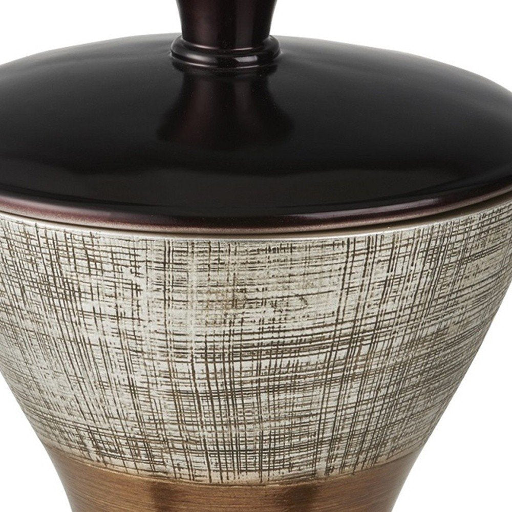 The 7-inch espresso gold and silver resin striped jewelry box with hand-painted designs combines functionality and style for your bedroom. Crafted from durable resin, this contemporary piece showcases a striking blend of espresso, gold, and silver tones. Its unique striped design is complemented by exquisite hand-painted details, making it a statement accessory for your decor. The lift-off lid provides easy access to your treasured jewelry, ensuring that your pieces are always organized and protected. This jewelry box is not just a storage solution; it adds an artistic touch to any space, beautifully merging elegance with practicality. Ideal for those who appreciate quality craftsmanship and modern aesthetics, it offers both beauty and utility. 10.25-inch h x 7.25-inch w x 7.25-inch d.