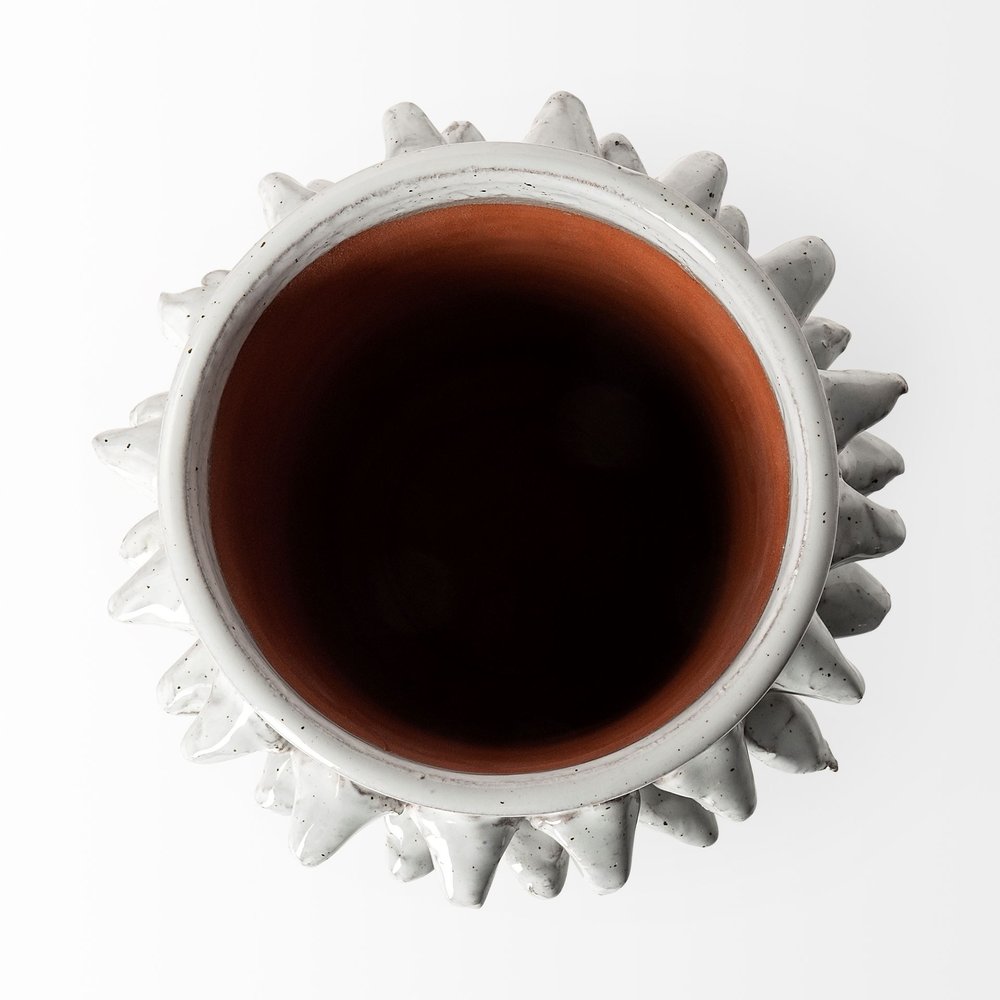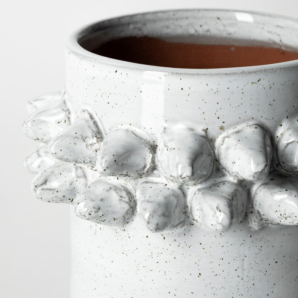 Elevate your space with this chic 7-inch gray abstract cylinder spikey ceramic table vase. A cylinder shape is paired with a unique spikey row of dimensional embellishments near the top and a gorgeous speckled glaze to add a modern and contemporary touch to any room. Crafted from durable terra cotta ceramic with a stylish speckled gray hue, this vase is perfect for displaying your favorite faux blooms or standing alone as a striking decor piece. Its versatile style makes it an ideal way to add a modern touch to most any decor, whether placed on a table, shelf, or mantel. 7.00-inch h x 5.70-inch w x 5.70-inch d.