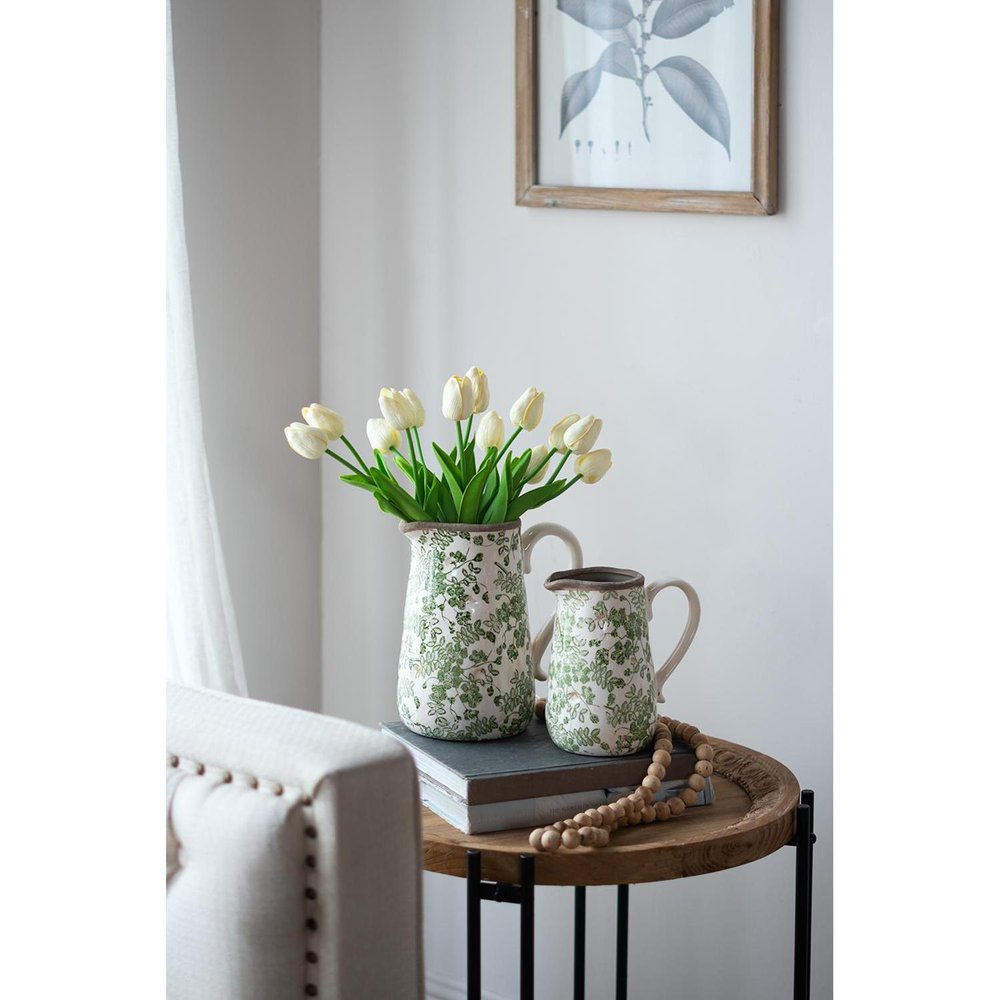 Ideal for displaying faux or dried flowers, it effortlessly elevates your home ambiance. This jug vase features a charming round shape that adds a touch of elegance to any setting. Crafted from high-quality ceramic, it offers a blend of durability and aesthetic appeal, making it a perfect choice for both modern and traditional decor styles. The smooth finish enhances its visual allure while also making it easy to clean and maintain. Whether placed on a dining table, shelf, or entryway, this vase serves as a delightful focal point that beautifully complements your floral arrangements, enriching the overall atmosphere of your living space. 7.10-inch h x 6.30-inch w x 4.50-inch d.