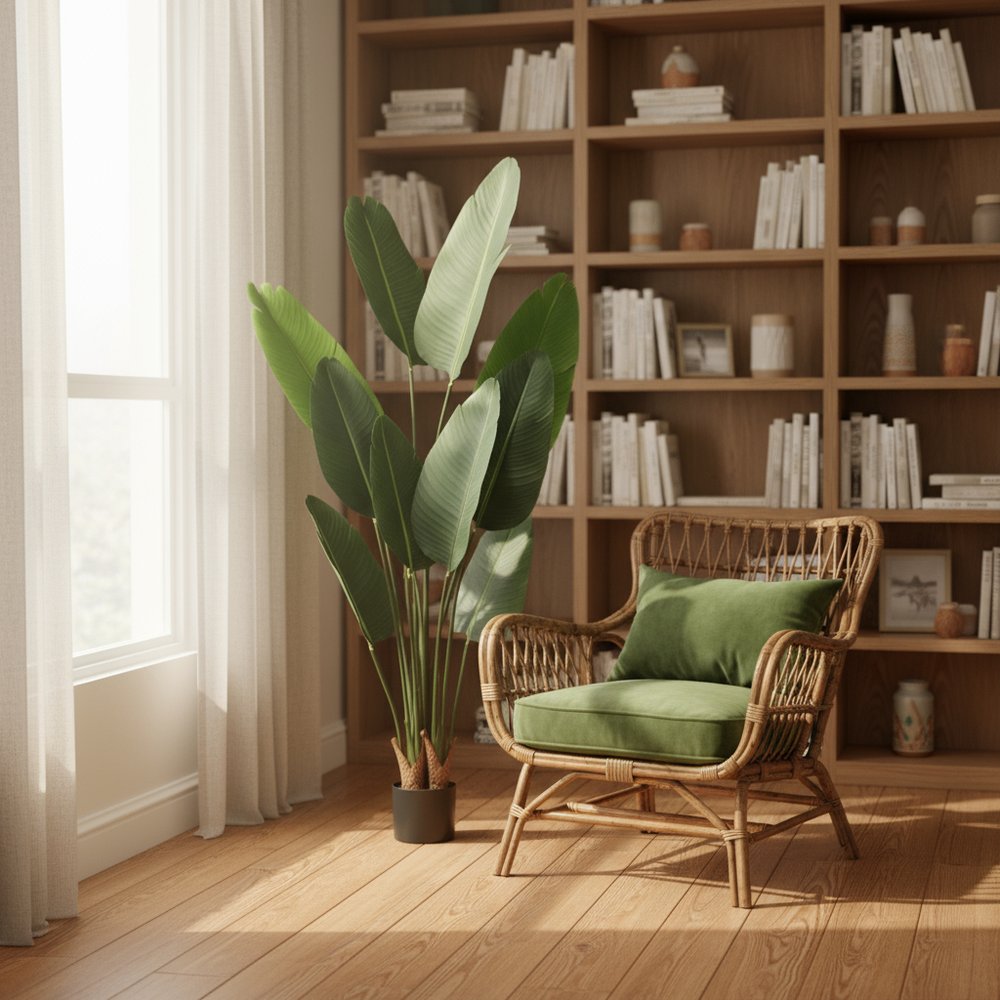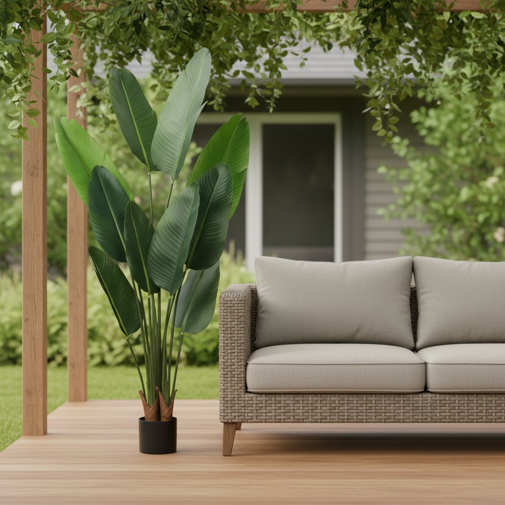 The 7-inch green artificial banana leaf in cylindrical black cement pot adds a touch of nature to your home decor. This beautiful tree features realistic green banana leaves that bring vibrant life to any space. Designed for floor placement, it serves as a stunning focal point in living rooms or offices. The artificial plant is made of high-quality plastic, ensuring durability and easy maintenance. This piece comes with a sleek black cement pot, perfectly complementing the lush foliage and adding a modern aesthetic. Suitable for outdoor use, this versatile decoration can also enhance patios or balconies. With its eye-catching design, this artificial plant is perfect for elevating your interior or exterior spaces effortlessly. 62.99-inch h x 6.69-inch w x 6.69-inch d.