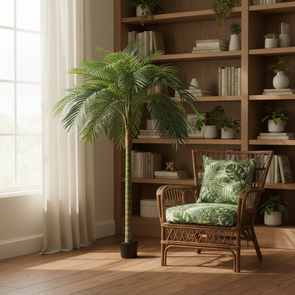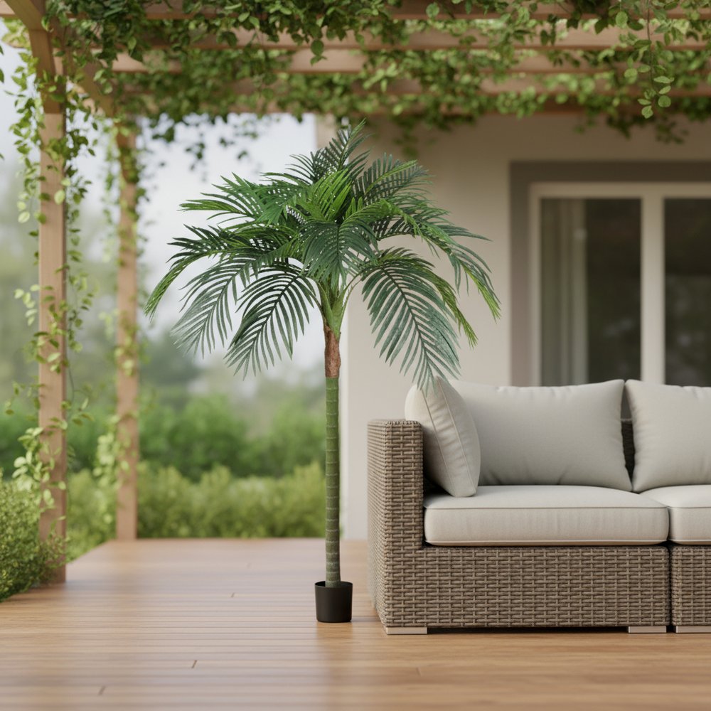 The 7-inch green artificial palm in cylindrical black cement pot is a stunning addition to any space. This vibrant green palm tree enhances your decor with its lifelike appearance and makes for a perfect floor plant. Crafted from durable plastic, it ensures long-lasting beauty without the need for maintenance. The black cement pot provides a modern touch, blending seamlessly with various interior styles. This versatile piece is suitable for both indoor and outdoor use, allowing you to create a refreshing atmosphere wherever it’s placed. Its compact size makes it easy to integrate into any corner of your home or patio, offering a touch of nature without the hassle of care. Enjoy the beauty of foliage all year round with this elegant artificial plant. 70.87-inch h x 6.69-inch w x 6.69-inch d.