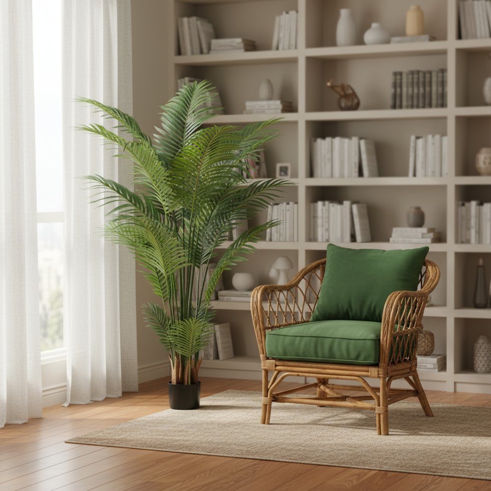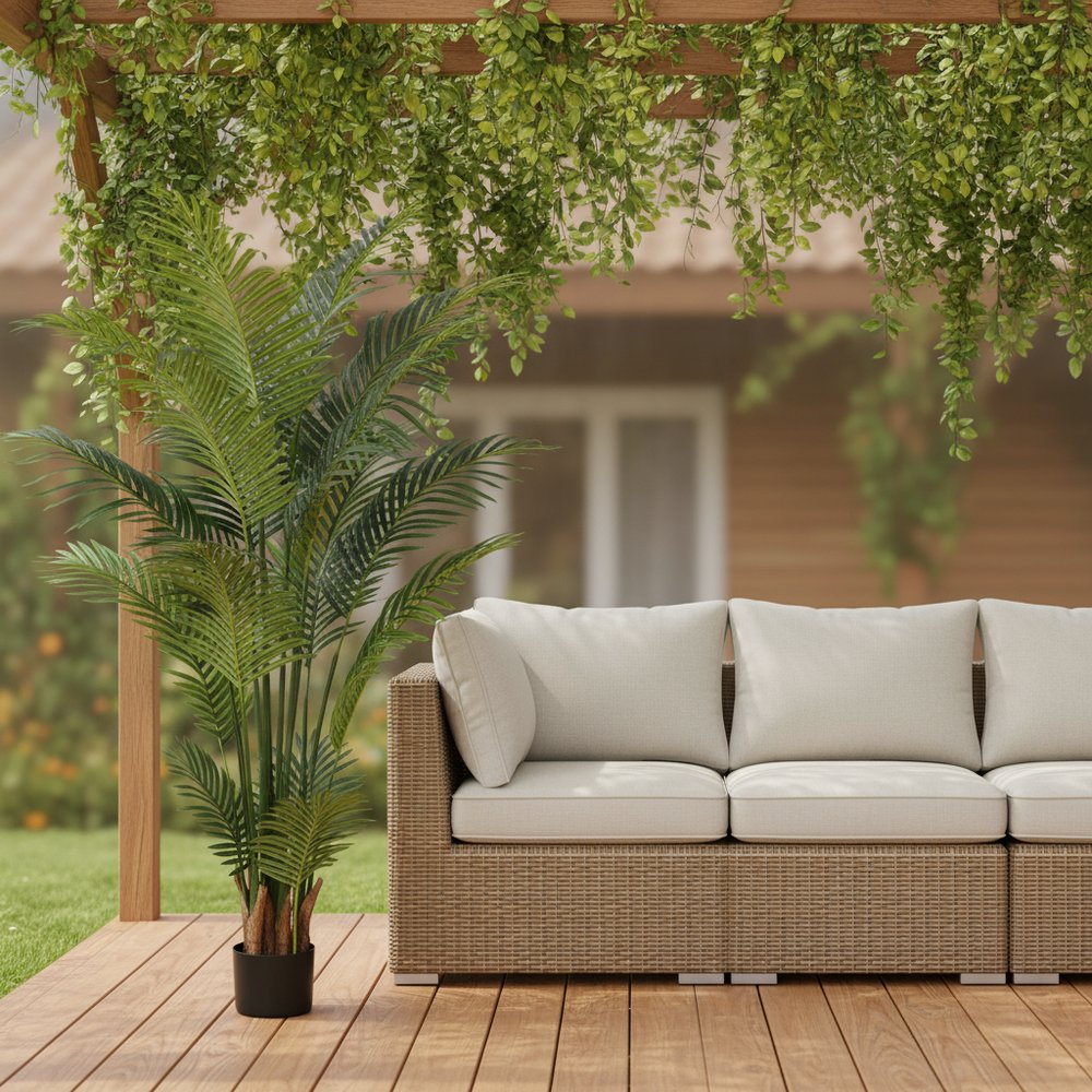 7-inch green artificial palm in cylindrical black cement pot is a perfect addition to elevate your home decor. This lifelike palm tree features vibrant green leaves that bring a touch of nature indoors. Designed for floor placement, it adds height and elegance to any room. The black cement pot provides a sturdy base, complementing the plant's striking appearance. Made from durable plastic, this artificial plant is perfect for outdoor use, allowing you to enhance your patio or garden decor. Its versatile design makes it suitable for various decor styles, offering a hassle-free way to enjoy greenery without the need for maintenance. Create a serene atmosphere with this stunning artificial palm that brightens up any space. 59.06-inch h x 6.69-inch w x 6.69-inch d.